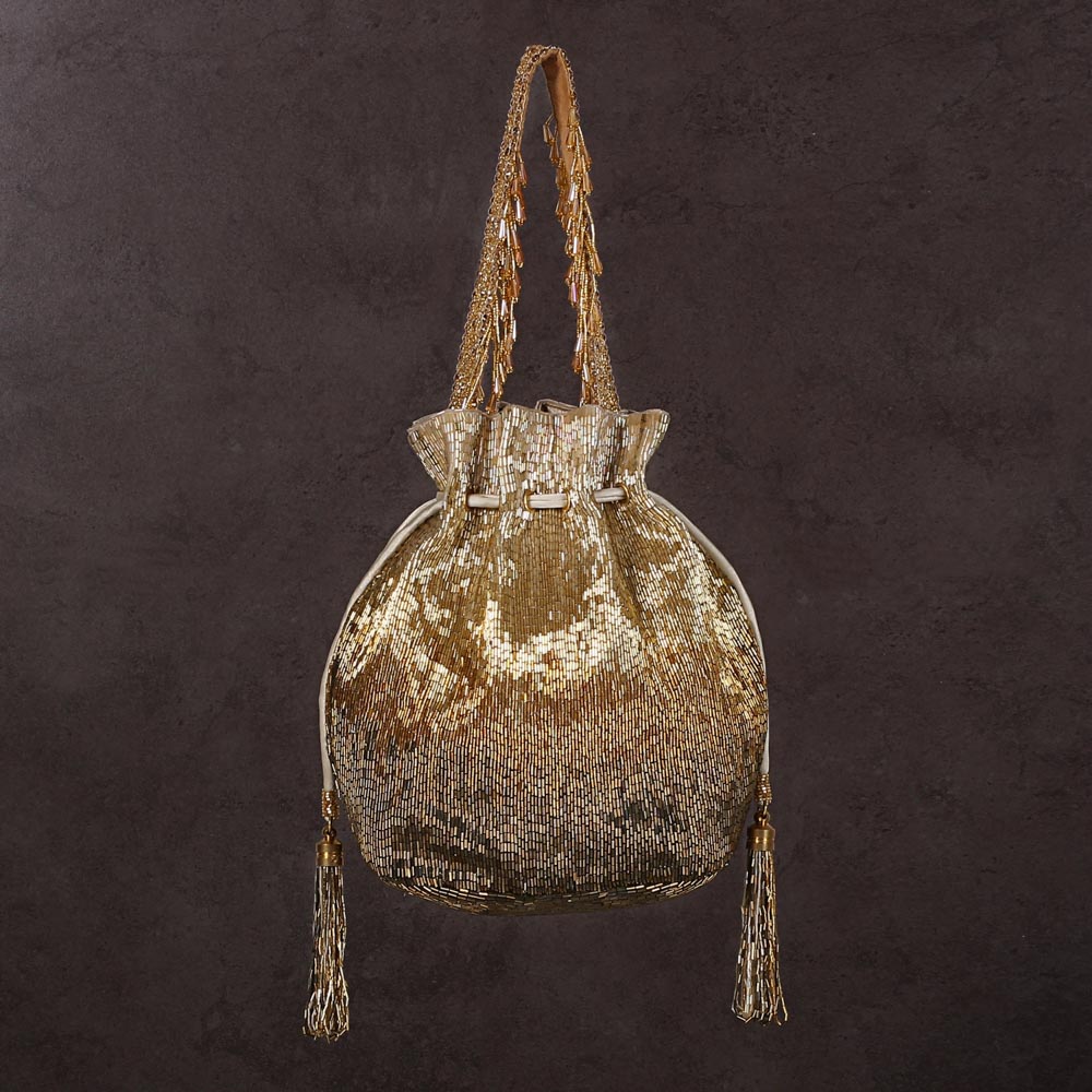 All That Glitters, Celebratio, COD, Collection, East Meets West, Essential The Wedding Edit, Glam Golds, Glam Golds At Special Prices, Glimmering Golds, Gold and Silver, Heart of Gold, International Women's Day, Latest Bestsellers, Metallics, Most Loved, Most Loved Old, Most Loved Styles, Most Wishlisted, Mother's Day Special, Party, Pouches, Resort, Shop, The Cocktail Hour, Valentine's Day GiftsDelicate Japanese glass beads hand-embroidered pouch with a wrist and long chain handle. Color: Peerless Gold Handle: Detachable long crossbody chain Wristlet Handles Embellished Handle Bag Dimensions: Length- 23 cms Width- 20 cms Composition: Top: Satin Lining: Soft Suedette Usage: Long chain Crossbody Shoulder Sling Hand-held₹11,900₹11,900 -