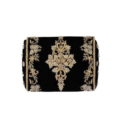 Celebratio, Clutches, COD, Collection, Old World Charm, Party Edit Old, Shop, Tryst with Tradition, Valentines Day OfferJapanese beads and fine dabka Zardosi hand embroidered pure velvet/silk box clutch with a metal concho , dimante clasp, chain handle and tassel at the bottom. Collection: Celebratio. Color: Heritage Black Handle: Detachable long crossbody chain Bag Dimensions: Length- 22 cms Width- 12 cms Composition: Top: Velvet Lining: Soft Suedette Usage: Long chain Crossbody Hand-held Shoulder Sling₹8,900₹8,900