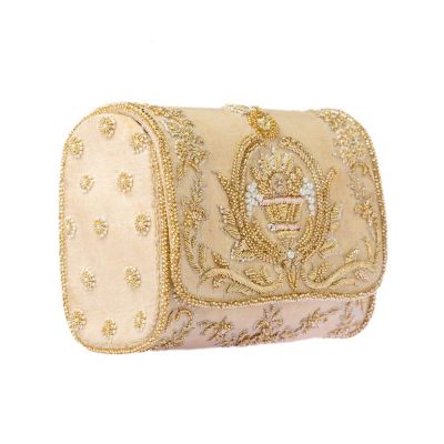 Celebratio, Clutches, COD, Collection, ShopJapanese beads and fine dabka Zardosi hand embroidered pure velvet/silk box clutch with a metal concho , dimante clasp, chain handle and tassel at the bottom. Color: Champagne Beige Handle: Detachable long crossbody chain Bag Dimensions: Length- 20 cms Width- 11 cms Composition: Top: Silk Lining: Soft Suedette Usage: Long chain Crossbody Hand-held Shoulder Sling₹8,900₹8,900 -