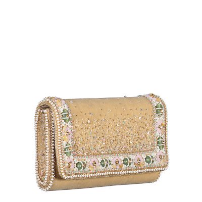 Bestsellers, Cherish, Clutches, COD, Collection, East Meets West, Gold and Silver, Most Loved, New, Party, Resort, Shop, The Cocktail Hour, Valentine's Day Gifts, Wedding and FestiveInspired by a whimsical tropical garden, delicate three dimensional flowers adorn our Esme Flapover Clutch Gold Silver on a textured bed of ombre gold to silver glistening bugle bead. Embellished with gold and silver Japanese beads, rhinestones, semi-precious stones, nuggets, crystals and pearls. The addition of our signature embellished handle makes it a statement accessory.This collectible statement accessory fits in your valuables like a smartphone, makeup, keys, currency and cards. Color: Peerless Gold Lustrous Silver Handle: Detachable long crossbody chain Embellished handle Bag Dimensions: Length- 18 cms Width- 10.5 cms Depth- 6.5 cms Composition: Top: Satin Lining: Soft Suedette Usage: Long chain Crossbody Hand-held Shoulder Sling Double chain shoulder bag₹14,900₹14,900 -