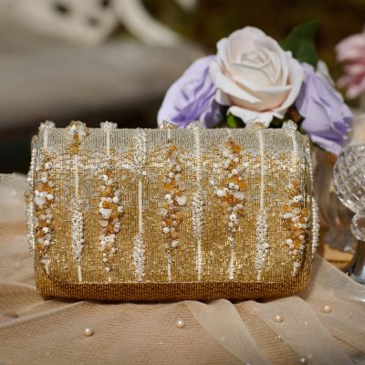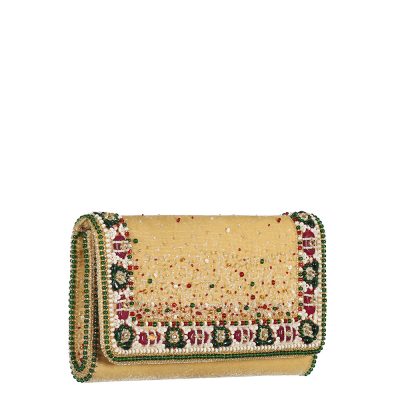 Cherish, Clutches, COD, Collection, East Meets West, Gemstone Wonder, Gold and Silver, Most Loved, New, Party, Shop, The Cocktail Hour, Valentine's Day GiftsThe Nora Flapover Clutch Gold Silver features an assortment of semi-precious stones, nuggets, pearls and iridescent crystals arranged in an abstract cluster over a glamorous metallic ombre gold and silver japanese beads base. The addition of our signature embellished handle makes it a statement accessory. This collectible statement accessory fits in your valuables like a smartphone, makeup, keys, currency and cards. Color: Peerless Gold Lustrous Silver Handle: Detachable long crossbody chain Embellished handle Bag Dimensions: Length- 18 cms Width- 10.5 cms Depth- 6.5 cms Composition: Top: Satin Lining: Soft Suedette Usage: Long chain Crossbody Hand-held Shoulder Sling Double chain shoulder bag₹14,900₹14,900 -