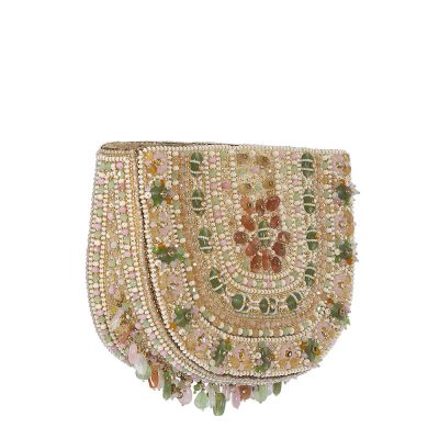 Bestsellers, Cherish, Clutches, COD, Collection, Gemstone Wonder, Magic of Multicolor, Most Loved, Most Loved Old, New, Now Trending, Pearls and Pastels, Shop, Tassel Treasures, Valentine's Day Gifts, Wedding and FestiveInspired by opulent encrusted legacy Jadau and Polki jewellery, the Amara Pastel Flapover Clutch Multi Hued is embellished with semi-precious quartz, stones, kundans and lustrous gold silver Japanese beads. It is finished with delicate asymmetrical handmade tassels at the bottom. The addition of our signature embellished handle makes it a statement piece. This collectible statement accessory fits in your valuables like a smartphone, makeup, keys, currency and cards. Color: Sublime Pastel MULTI Handle: Detachable long crossbody chain Embellished handle Bag Dimensions: Length- 18 cms Width- 10.5 cms Depth- 6.5 cms Composition: Top: Velvet Lining: Soft Suedette Usage: Long chain Crossbody Hand-held Shoulder Sling Double chain shoulder bag₹14,900₹14,900