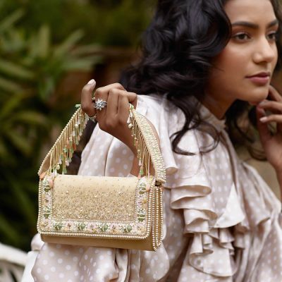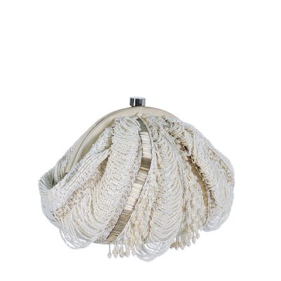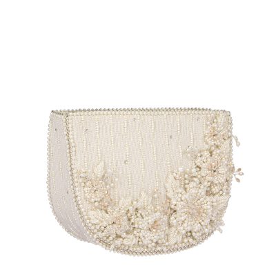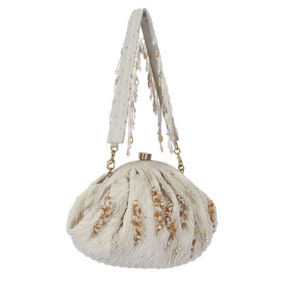 Cherish, COD, Collection, Most Loved, New, Pearls and Pastels, Pouches, Shop, Tassel Treasures, Valentine's Day GiftsThe Ruche Soft Pouch Ivory is hand embroidered with luminous Ivory, gold Japanese micro beads & baroque pearls in a pave’ application. Ornamental scallop tassels & wisply baroque fringes adorn the surface. The addition of our signature embellished handle makes it a statement accessory.This collectible statement accessory fits in your valuables like a smartphone, makeup, keys, currency and cards. Color: Pristine Ivory Handle: Detachable long crossbody chain Embellished handle Bag Dimensions: Length- 26 cms Width- 16 cms Composition: Top: Satin Lining: Soft Suedette Usage: Long chain Crossbody Hand-held Shoulder Sling₹11,900₹11,900 -