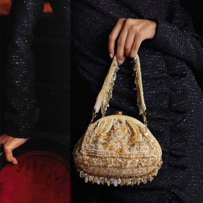 Cherish, COD, Collection, New, Potlis, ShopThe ethereal design of Veira Potli Pouch Gold Silver has been decadently hand-embroidered inspired by the serpent skin texture. It is embellished with lustrous Japanese beads, semi precious citrine, moonstones, rhinestones and delicately manicured fur in ombre Gold Silver pattern that is subtle yet striking. The addition of our signature embellished handle makes it a statement accessory. This collectible statement accessory fits in your valuables like a smartphone, makeup, keys, currency and cards. Color: Peerless Gold Lustrous Silver Handle: Detachable long crossbody chain Wristlet Handles Bag Dimensions: Length- 25 cms Width- 22 cms Composition: Top: Satin Lining: Soft Suedette Usage: Long chain Crossbody Hand-held Shoulder Sling₹9,900₹9,900 -
