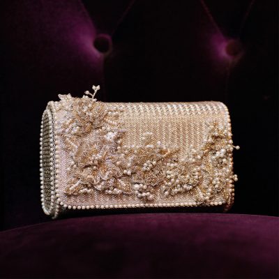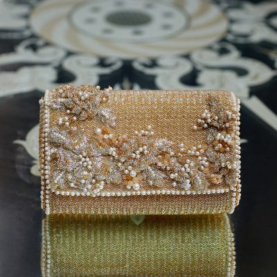 Cherish, Clutches, COD, Collection, Most Loved, New, ShopThe ethereal design of Veira Flapover Clutch Gold Silver has been decadently hand-embroidered inspired by the serpent skin texture. It is embellished with lustrous Japanese beads, semi precious citrine, moonstones, rhinestones and delicately manicured fur in ombre Gold Silver pattern that is subtle yet striking. The addition of our signature embellished handle makes it a statement accessory. This collectible statement accessory fits in your valuables like a smartphone, makeup, keys, currency and cards. Color: Peerless Gold Lustrous Silver Handle: Detachable long crossbody chain Embellished handle Bag Dimensions: Length- 18 cms Width- 10.5 cms Depth- 6.5 cms Composition: Top: Satin Lining: Soft Suedette Usage: Long chain Crossbody Hand-held Shoulder Sling Double chain shoulder bag₹11,900₹11,900 -