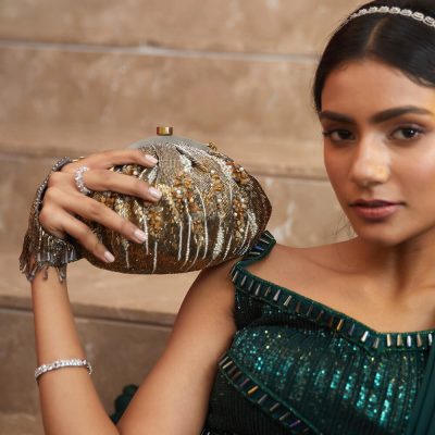 Cherish, COD, Collection, New, Pouches, ShopThe ethereal design of Veira Soft Pouch Gold Silver has been decadently hand-embroidered inspired by the serpent skin texture. It is embellished with lustrous Japanese beads, semi precious citrine, moonstones, rhinestones and delicately manicured fur in ombre gold silver pattern that is subtle yet striking. The addition of our signature embellished handle makes it a statement accessory. This collectible statement accessory fits in your valuables like a smartphone, makeup, keys, currency and cards. Color: Peerless Gold Lustrous Silver Handle: Detachable long crossbody chain Embellished handle Bag Dimensions: Length- 26 cms Width- 16 cms Composition: Top: Satin Lining: Soft Suedette Usage: Long chain Crossbody Hand-held Shoulder Sling₹11,900₹11,900 -