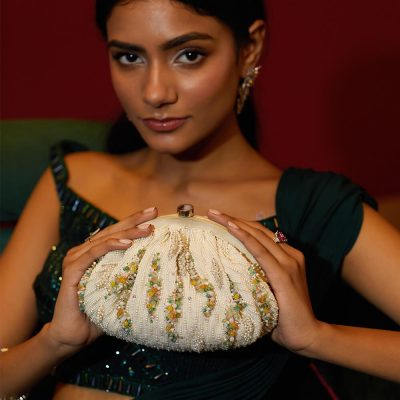 Cherish, Clutches, COD, Collection, East Meets West, Gemstone Wonder, Most Loved, New, Party, Shop, The Cocktail Hour, Valentine's Day GiftsThe Nora Flapover Clutch Ivory Gold Silver features an assortment of semi-precious stones, nuggets, pearls and iridescent crystals arranged in an abstract form over a pearlesque ivory base. The addition of our signature embellished handle makes it a statement accessory. This collectible statement accessory fits in your valuables like a smartphone, makeup, keys, currency and cards. Color: Pristine Ivory Peerless Gold Lustrous Silver Handle: Detachable long crossbody chain Embellished handle Bag Dimensions: Length- 18 cms Width- 10.5 cms Depth- 6.5 cms Composition: Top: Satin Lining: Soft Suedette Usage: Long chain Crossbody Hand-held Shoulder Sling Double chain shoulder bag₹14,900₹14,900 -