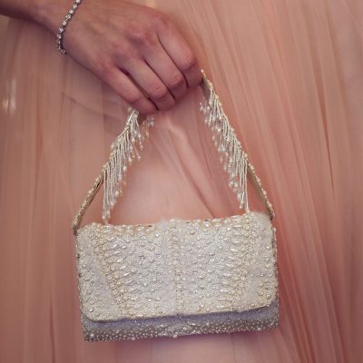 Cherish, Clutches, Collection, Minis, New Arrivals, ShopThe Opal Mini Trapezium in Pristine Ivory is hand-embroidered with semi-precious pearls, gems, precision cut Japanese microbeads, and crystals in a subtle ombré design. It's compact, structured shape adds a bold, modern edge, while the embellished top handle and a crossbody chain provide versatile styling options. Perfect for holding makeup, currency, cards and keys, and includes an inside slip pocket for easy organization. Color: Pristine Ivory Handle: Embellished Top Handle, Detachable Crossbody Chain Bag Dimensions: Length- 13.5 cms Height- 10.5 cms Width- 5.5 cms Composition: Top: Satin Lining: Soft Suedette Usage: Handheld, Crossbody₹8,900₹8,900 -