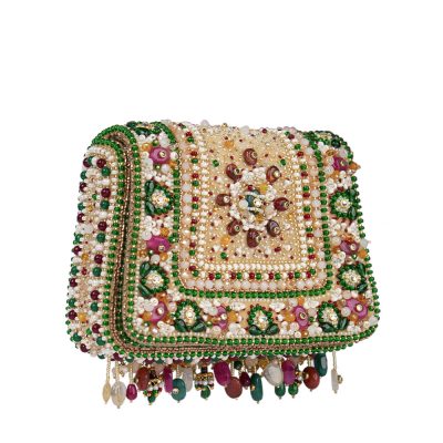 Cherish, Clutches, Collection, Elite Minis, Minis, Shop, Valentine's Day GiftsInspired by opulent encrusted legacy Jadau and Polki jewellery, the Amara Mini Trapezium Ruby Red Emerald Green Multi is embellished with semi-precious rubies, emeralds, stones, nuggets with kundans and lustrous gold silver Japanese beads. It is finished with delicate asymmetrical handmade tassels at the bottom. Color: Ruby Red Emerald Green Multi Handle: Detachable long crossbody chain Bag Dimensions: Length- 13.5 cms Width- 5.5 cms Height- 10.5 cms Composition: Top: Velvet Lining: Soft Suedette Usage: Long chain Crossbody Shoulder Sling Double chain shoulder bag₹7,900₹7,900