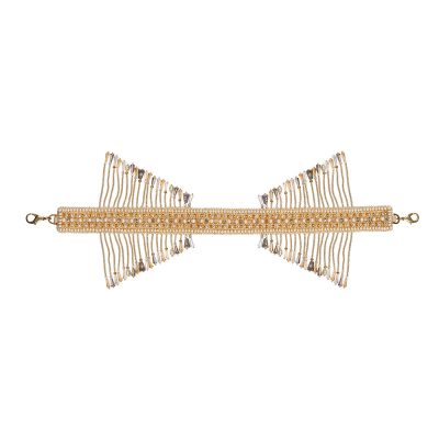 Collection, Embellished Handles, Glam Golds, Glimmering Golds, Handles, NOCOD, Shop, Valentine's Day GiftsThis signature feature handle is delicately hand embroidered with Lustrous Japanese micro beads, crystals and diamanté'. It is a detachable statement add on that grants versatility to any heirloom bag , enabling the opportunity to wear the bag in multiple ways or take it from day to night. With detachable doghooks on both ends, the glittering radiance of the crystal tassels augmentss the playful & youthful demeanour of any bag. Color: Peerless Gold Handle Dimensions: Length- 34 cms Width- 2.5 cms Composition: Top: Satin Lining: Suedette Usage: Bag Handle₹2,000₹2,000