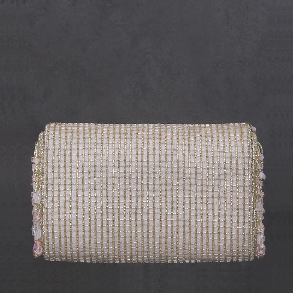 Bestsellers, Clutches, COD, Collection, Embracing Legacies, Festive Hues, Gemstone Wonder, Jewel Tones, Most Loved, Neutrals, Now Trending, Ornamental Chic, Pearls and Pastels, Shop, Tassel Treasures, Valentine's Day GiftsThis bejewelled flapover clutch is decadently hand embroidered with an assortment of lustrous semi precious gems, Japanese micro beads & crystals in an ombré pattern. It has an ornate yet elegant look. It comes with a matching hand embellished handle & a long chain, to style it with both modern and traditional outfits. The handle is delicately hand embroidered with lustrous micro beads, crystals and diamanté.The glittering radiance of the crystal tassels, augments the elegant demeanour of this clutch. This handle can also be used with any existing bag. Color: Rose Quartz Pink Handle: Detachable long crossbody chain Embellished handle Bag Dimensions: Length- 18 cms Width- 10.5 cms Depth- 6.5 cms Composition: Top: Satin Lining: Soft Suedette Usage: Long chain Crossbody Hand-held Shoulder Sling Double Chain Shoulder Bag₹11,900₹11,900 -