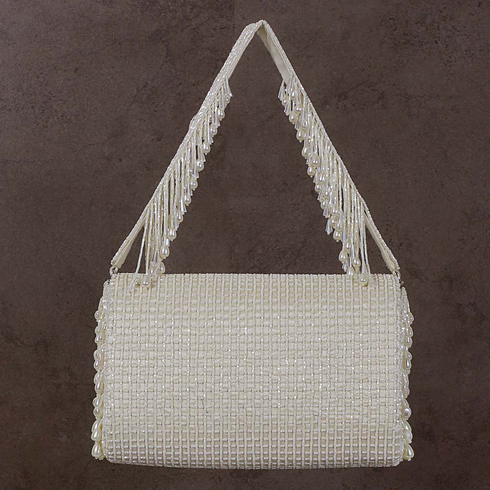 Bestsellers, Classic Pearls, Clutches, COD, Collection, Embracing Legacies, Festive Hues, Gemstone Wonder, Jewel Tones, Most Loved, Most Loved Old, Most Loved Styles, Neutrals, Ornamental Chic, Pearls and Pastels, Shop, Tassel Treasures, Valentine's Day GiftsThis bejewelled flapover clutch is decadently hand embroidered with an assortment of lustrous baroque pearls, Japanese micro beads & crystals. it has an ornate yet delicate look. It comes with a matching embellished handle & a long chain, to style it with both modern and traditional outfits. The handle is delicately hand embroidered with lustrous micro beads, crystals and diamanté.The glittering radiance of the crystal tassels, augments the elegant demeanour of this clutch. This handle can also be used with any existing bag. Color: Pristine Ivory Handle: Detachable long crossbody chain Embellished handle Bag Dimensions: Length- 18 cms Width- 10.5 cms Depth- 6.5 cms Composition: Top: Satin Lining: Soft Suedette Usage: Long chain Crossbody Hand-held Shoulder Sling Double Chain Shoulder Bag₹11,900₹11,900 -
