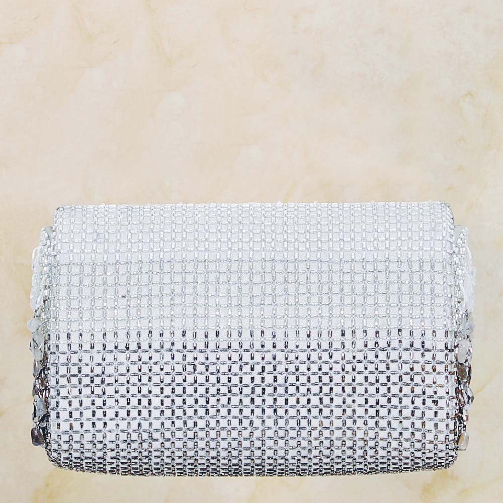 Antiques and Blacks, Clutches, COD, Collection, Embracing Legacies, Gemstone Wonder, Gold and Silver, Jewel Tones, Most Loved, Ornamental Chic, Pearls and Pastels, Shop, Sparkling Silvers, Tassel Treasures, Valentine's Day GiftsThis bejewelled flapover clutch is decadently hand embroidered with an assortment of lustrous semi precious gems, Japanese micro beads & crystals in an ombré pattern. It has an ornate yet elegant look. It comes with a matching hand embellished handle & a long chain, to style it with both modern and traditional outfits. The handle is delicately hand embroidered with lustrous micro beads, crystals and diamanté.The glittering radiance of the crystal tassels, augments the elegant demeanour of this clutch. This handle can also be used with any existing bag. Color: Lustrous Silver Handle: Detachable long crossbody chain Embellished handle Bag Dimensions: Length- 18 cms Width- 10.5 cms Depth- 6.5 cms Composition: Top: Satin Lining: Soft Suedette Usage: Long chain Crossbody Hand-held Shoulder Sling Double Chain Shoulder Bag"₹11,900₹11,900 -