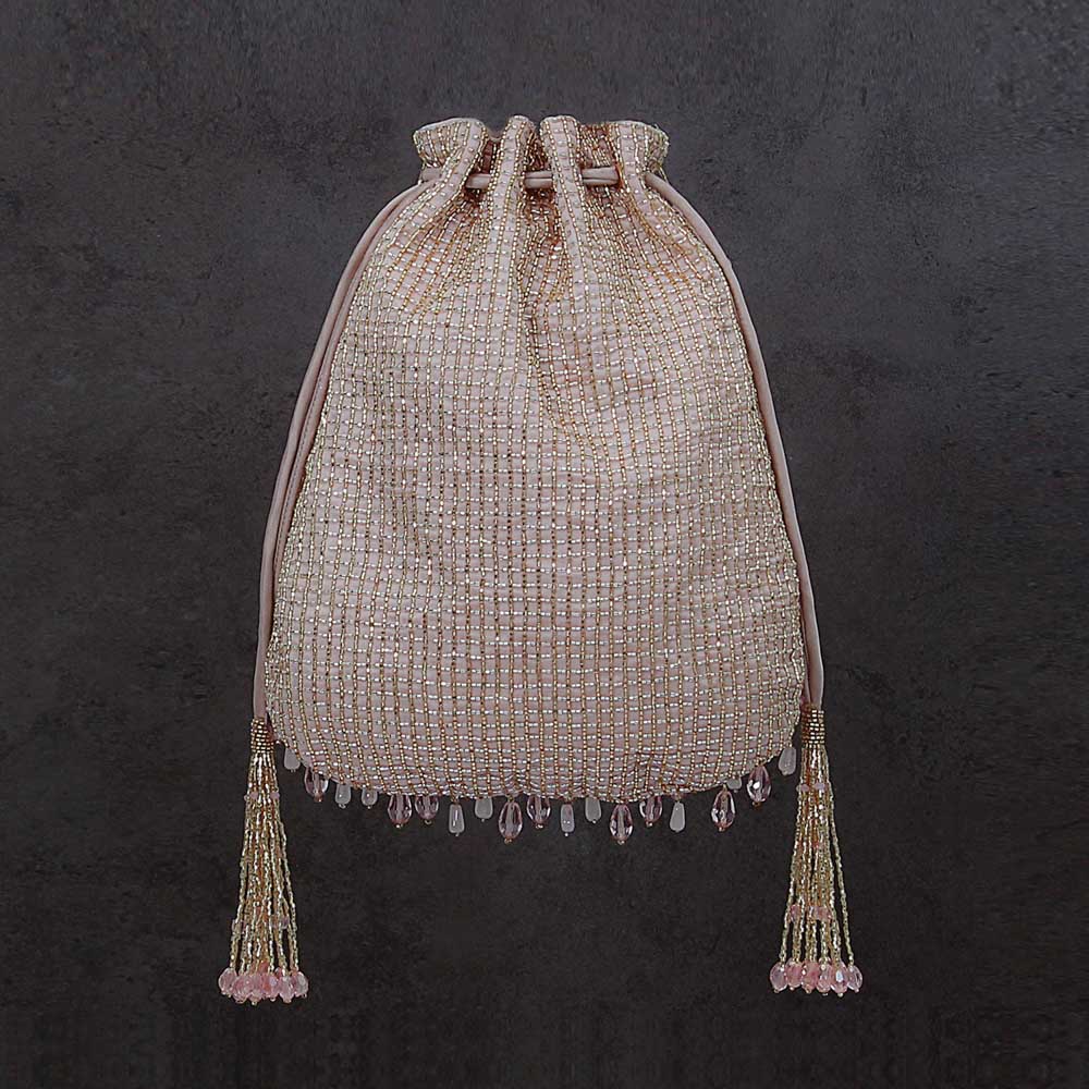 Bestsellers, COD, Collection, Embracing Legacies, Festive Hues, Gemstone Wonder, Jewel Tones, Most Loved, Most Loved Old, Most Loved Styles, Ornamental Chic, Pearls and Pastels, Potlis, Shop, Tassel Treasures, Valentine's Day GiftsThis bejewelled potli pouch is decadently hand embroidered with an assortment of lustrous semi precious gems, Japanese micro beads & crystals in an ombré pattern. The handle is delicately hand embroidered with lustrous micro beads, crystals and diamanté.The glittering radiance of the crystal tassels, augments the elegant demeanour of this potli. Color: Rose Quartz Pink Handle: Detachable long crossbody chain Wristlet Handles Embellished Handle Bag Dimensions: Length- 25 cms Width- 21 cms Composition: Top: Satin Lining: Soft Suedette Usage: Long chain Crossbody Hand-held Shoulder Sling₹11,900₹11,900 -