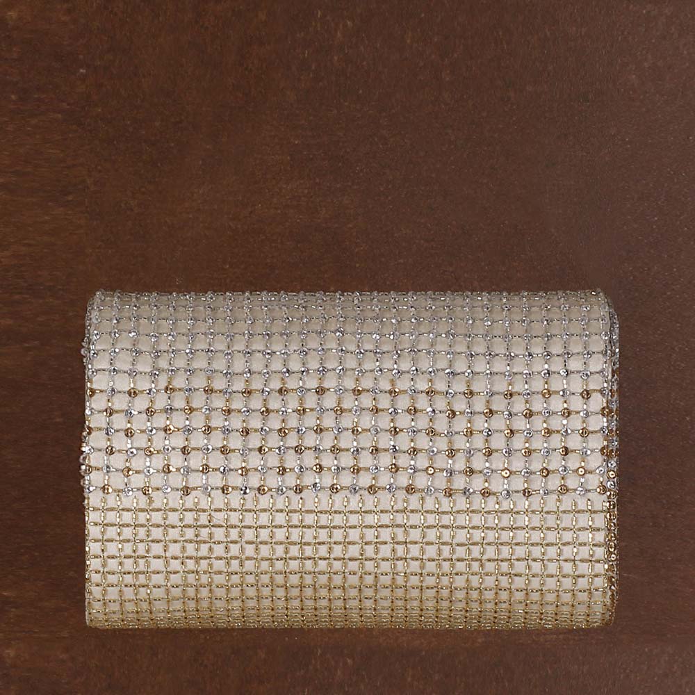 Clutches, COD, Collection, Embracing Legacies, Glam Golds, Glimmering Golds, Most Loved, Shop, Sparkling Silvers, Versatile Mixed Metallics Gold and SilverThis luxe minimalistic flapover clutch is decadently hand embroidered with an assortment of lustrous rhinestones & Japanese micro beads in a gold to silver ombré pattern. Inspired by the nostalic 90s' metallic chain mail, it has a minimal yet glamorous look. It comes with a matching hand embellished handle & a long chain, to style it with both modern and traditional outfits. The handle is delicately hand embroidered with lustrous micro beads, crystals and diamanté.The glittering radiance of the crystal tassels, augments the elegant demeanour of this clutch. Color: Peerless Gold Lustrous Silver Handle: Detachable long crossbody chain Embellished handle Bag Dimensions: Length- 18 cms Width- 10.5 cms Depth- 6.5 cms Composition: Top: Satin Lining: Soft Suedette Usage: Long chain Crossbody Hand-held Shoulder Sling Double chain shoulder bag₹9,900₹9,900 -