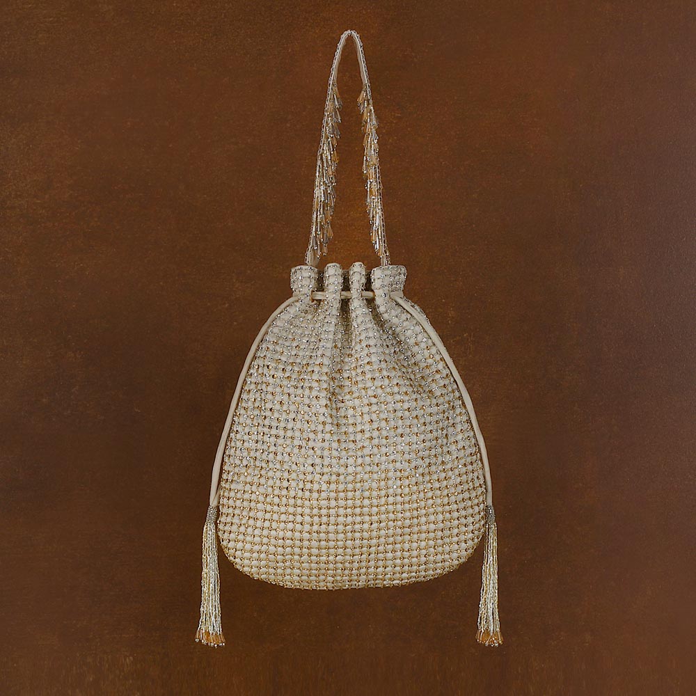Classic Pearls, COD, Collection, Embracing Legacies, Festive Hues, Gemstone Wonder, Jewel Tones, Most Loved, Most Loved Old, Most Loved Styles, Ornamental Chic, Pearls and Pastels, Potlis, Shop, Tassel Treasures, Valentine's Day GiftsThis bejewelled potli pouch is decadently hand embroidered with an assortment of lustrous baroque pearls, Japanese micro beads & crystals. It has an ornate yet delicate look. It comes with a matching embellished handle & a long chain, to style it with both modern and traditional outfits. The handle is delicately hand embroidered with lustrous micro beads, crystals and diamanté. The glittering radiance of the crystal tassels, augments the elegant demeanour of this potli. This handle can also be used with any existing bag. Color: Pristine Ivory Handle: Detachable long crossbody chain Wristlet Handles Embellished Handle Bag Dimensions: Length- 25 cms Width- 21 cms Composition: Top: Satin Lining: Soft Suedette Usage: Long chain Crossbody Hand-held Shoulder Sling₹11,900₹11,900 -