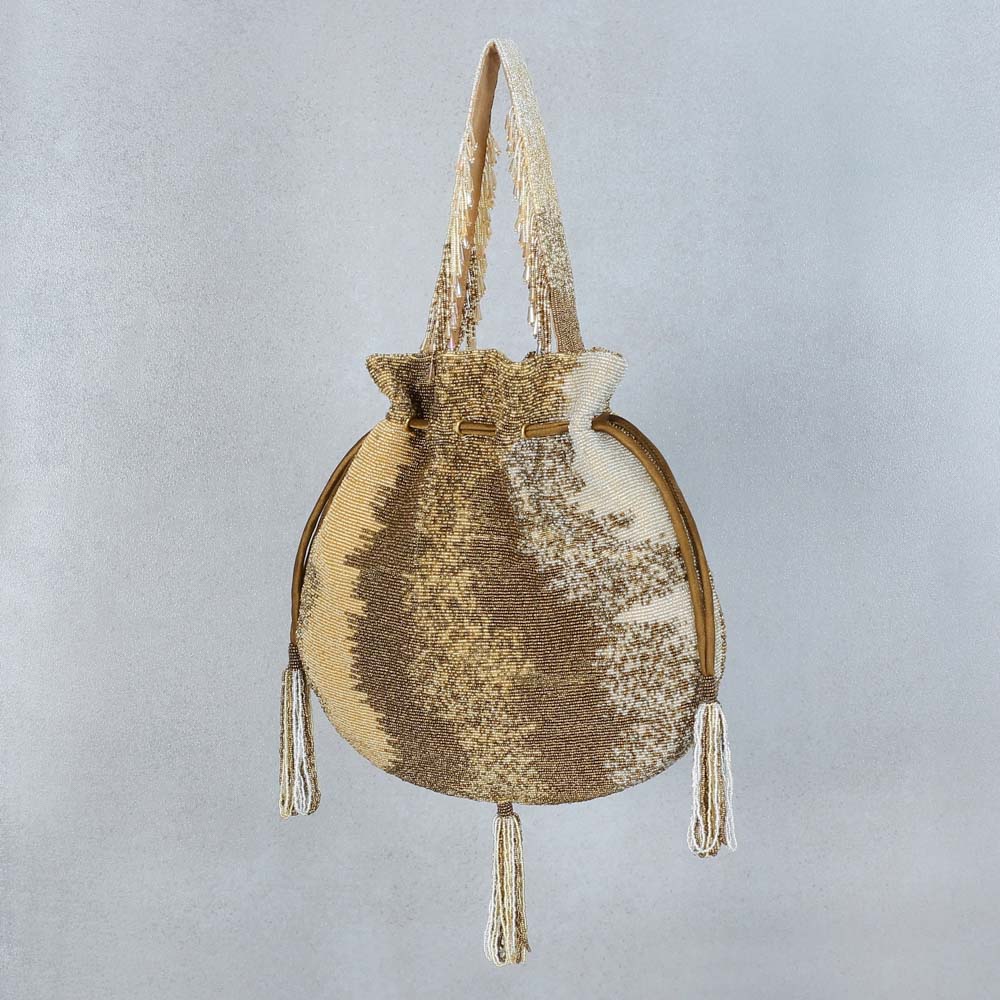 COD, Collection, Essential The Wedding Edit, Festive Hues, Glam Golds, Glimmering Golds, Gold and Silver, Gold Pop, Heart of Gold, Here, Latest Bestsellers, Most Loved, Mother's Day Special, Potlis, Shop, Wedding and Festive, Wishing you a Happy HoliThis elegant and timeless pouch doubles up as a bucket bag and a potli. It is delicately hand embroidered with fine japanese beads. It has a suedette lining, long detacheable chain handle, wristlet handles and handbeaded tassels. The design is reminiscent of the patterns created by mist and fog in a meditative setting and is symbolic of the idea that all the world's beauty is present right HERE within us. Color: Peerless Gold Handle: Detachable long crossbody chain Wristlet Handles Bag Dimensions: Length- 24 cms Width- 26 cms Composition: Top: Satin Lining: Soft Suedette Usage: Long chain Crossbody Hand-held Shoulder Sling₹11,900₹11,900