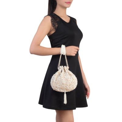 Classic Pearls, Classic Pearls At Special Prices, COD, Collection, Essential The Wedding Edit, Festive Hues, Here, Most Loved, Most Loved Old, Most Loved Styles, Most Wishlisted, Mother's Day Special, Pearl Magic, Potlis, Pretty in Pearls, Shop, Special Prices - Style Diaries, Summer Wedding Edit, Timeless Potlis At Special PricesThis elegant and timeless pearl pouch doubles up as a bucket bag and a potli. It is delicately hand embroidered with fine japanese beads, pearls and dimantes. It has a suedette lining ,long detacheable chain handle, wristlet handles and handbeaded tassels .The design is reminiscent of the patterns created by mist and fog in a meditative setting and is symbolic of the idea that all the world's beauty is present right HERE within us. Color: Pristine Ivory Handle: Detachable long crossbody chain Wristlet Handles Bag Dimensions: Length- 24 cms Width- 26 cms Composition: Top: Satin Lining: Soft Suedette Usage: Long chain Crossbody Hand-held Shoulder Sling₹11,900₹11,900 -