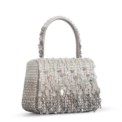 The Opal Mini Trapezium in Lustrous Silver is hand-embroidered with semi-precious gems, precision cut Japanese microbeads, and crystals in a shimmering ombré design. It's compact, structured shape adds a bold, modern edge, while the embellished top handle and a crossbody chain provide versatile styling options. Perfect for holding makeup, currency, cards and keys, and includes an inside slip pocket for easy organization. Color: Lustrous Silver Handle: Embellished Top Handle, Detachable Crossbody Chain Bag Dimensions: Length- 13.5 cms Height- 10.5 cms Width- 5.5 cms Composition: Top: Satin Lining: Soft Suedette Usage: Handheld, Crossbody