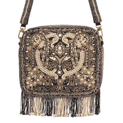COD, Collection, Festive Flair, Messenger Bag, Moira - The Resort Collection, Old World Charm, Ornamental Chic, Shop, Zuri Zora - My Beautiful FriendThis eclectic messenger cross body bag is sumptously hand embroidered with luminous Japanese micro beads, glass crystals & baroque pearls. Inspired by heritage Kashmiri kanikar shawls, Indian North Eastern stripe weaves & French pashmina designs, this is a timeless piece . This pouch can be used from both sides, as an archival paisley design adorns the front while nonchalant embellished stripes dress the back. It has handmade zardosi striped tassels. Color: Heritage Black Handle: Detachable Long Embellished handle Bag Dimensions: Length- 18 cms Width- 10.5 cms Depth- 6.5 cms Composition: Top: Satin Lining: Soft Suedette Usage: Crossbody Bag Shoulder Sling₹9,900₹9,900