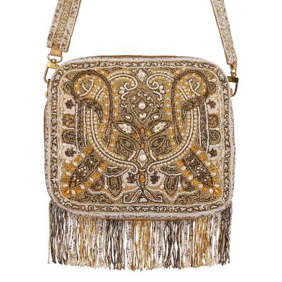 COD, Collection, Festive Flair, Glam Golds, Glam Golds At Special Prices, Glimmering Golds, Moira - The Resort Collection, Most Loved Old, Most Loved Styles, Ornamental Chic, Pouches, Shop, Zuri Zora - My Beautiful FriendThis eclectic soft pouch is sumptuously hand embroidered with luminous Japanese micro beads, glass crystals & baroque pearls. Inspired by heritage Kashmiri Kanikar shawls, Indian North eastern stripe weaves & French Pashmina design this is a timeless piece . This pouch can be used from either side as an archival paisley design adorns the front while nonchalant embellished stripes dress the back. It has handmade zardosi striped tassels. Color: Peerless Gold Handle: Detachable long crossbody chain Bag Dimensions: Length- 26 cms Width- 16 cms Composition: Top: Satin Lining: Soft Suedette Usage: Long chain Crossbody Hand-held Shoulder Sling₹9,900₹9,900 -