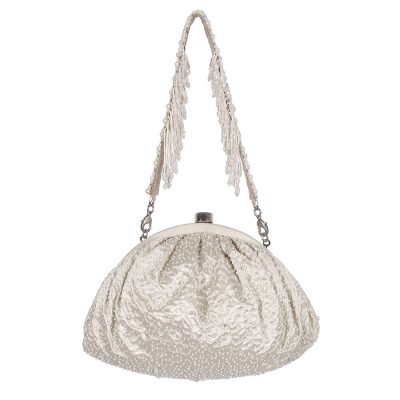 Cherish, COD, Collection, Most Loved, New, Pearls and Pastels, Pouches, Shop, Tassel Treasures, Valentine's Day GiftsThe Ruche Soft Pouch Ivory is hand embroidered with luminous Ivory, gold Japanese micro beads & baroque pearls in a pave’ application. Ornamental scallop tassels & wisply baroque fringes adorn the surface. The addition of our signature embellished handle makes it a statement accessory.This collectible statement accessory fits in your valuables like a smartphone, makeup, keys, currency and cards. Color: Pristine Ivory Handle: Detachable long crossbody chain Embellished handle Bag Dimensions: Length- 26 cms Width- 16 cms Composition: Top: Satin Lining: Soft Suedette Usage: Long chain Crossbody Hand-held Shoulder Sling₹11,900₹11,900 -