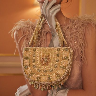 Burst The Bubble, Cherish, Clutches, Collection, Elite Minis, Minis, New Arrivals, Now Trending, Pearls and Pastels, Ready to Ship, Resort, Shop, Tassel TreasuresThe Joel design pays homage to heritage jaali work, capturing its mysterious play of light and shadow through intricate pearl and beadwork. Natural pearl drops enhance its graceful demeanour. Our mini trapezium bag is a compact and edgy silhouette. This flapover is designed with soft edges. The embellished attached round handle makes it a statement hand held bag. This collectible accessory fits in your valuables like makeup, keys, currency and cards. Color: Pristine Ivory Handle: Embellished Handle Detachable long crossbody chain Bag Dimensions: Length- 13.5 cms Width- 5.5 cms Height- 10.5 cms Composition: Top: Satin Lining: Soft Suedette Usage: Hand-held Long chain Crossbody Shoulder Sling Double chain shoulder bag₹8,900₹8,900 -