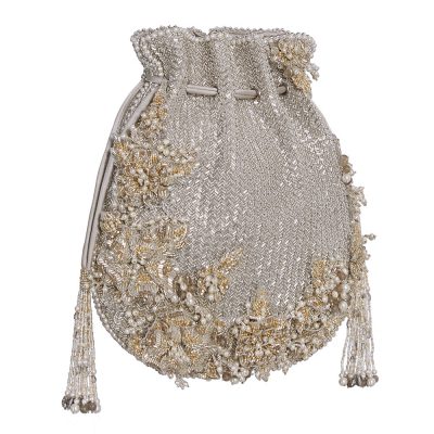 Cherish, COD, Collection, New, Potlis, Ready to Ship, Shop, Valentine's Day GiftsInspired by a whimsical tropical garden, delicate three dimensional flowers adorn our Esme Potli Pouch Gold Silver on a textured bed of ombre gold to silver glistening bugle bead. Embellished with gold and silver Japanese beads, rhinestones, semi-precious stones, nuggets, crystals and pearls. This collectible statement accessory fits in your valuables like a smartphone, makeup, keys, currency and cards. Color: Peerless Gold Lustrous Silver Handle: Detachable long crossbody chain Wristlet Handles Embellished handle Bag Dimensions: Length- 24 cms Width- 19 cms Depth- 23 cms Composition: Top: Satin Lining: Soft Suedette Usage: Long chain Crossbody Hand-held Shoulder Sling₹12,900₹12,900 -
