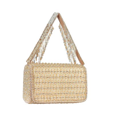 Cherish, Collection, Gold and Silver, New Arrivals, Pouches, Resort, Shop, Tassel TreasuresThe Joel design pays homage to heritage jaali work, capturing its mysterious play of light and shadow through intricate crystal and beadwork. Faceted crystal drops enhance its graceful demeanour. Our signature embellished handle has cascading teardrop pearls and luminous crystals. The Lovetobag ruched soft pouch with is an elegant and modern take on the vintage style frame bags. It features a metallic clasp closure and an inside slip pocket. It comes with a detachable chain handle to style it as a crossbody. This functional piece of art fits in your small valuables like jewellery, smartphone, cash and cards. Color: Peerless Gold Lustrous Silver Handle: Embellished Handle Detachable long crossbody chain Bag Dimensions: Length- 26 cms Width- 16 cms Composition: Top: Satin Lining: Soft Suedette Usage: Hand-held Long chain Crossbody Shoulder Sling₹10,900₹10,900 -