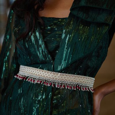 Cherish, Collection, Shop, Waist BeltsThe ethereal design has been decadently hand-embroidered inspired by the serpent skin texture. The Kiah Belt Pristine Ivory Emerald Green is an elegant statement piece of accessory. Embellished with Japanese ivory beads, iridescent crystals, quartz nuggets and semi precious emerald stones, it has ornate tassels. Color: Pristine Ivory Emerald Green Waist Belt Dimensions: Length- 65 cms Width- 3.5 cms Composition: Top: Satin Lining: Soft Suedette Usage: Size Adjustable Waist Belt Shoulder Handle₹6,900₹6,900 -