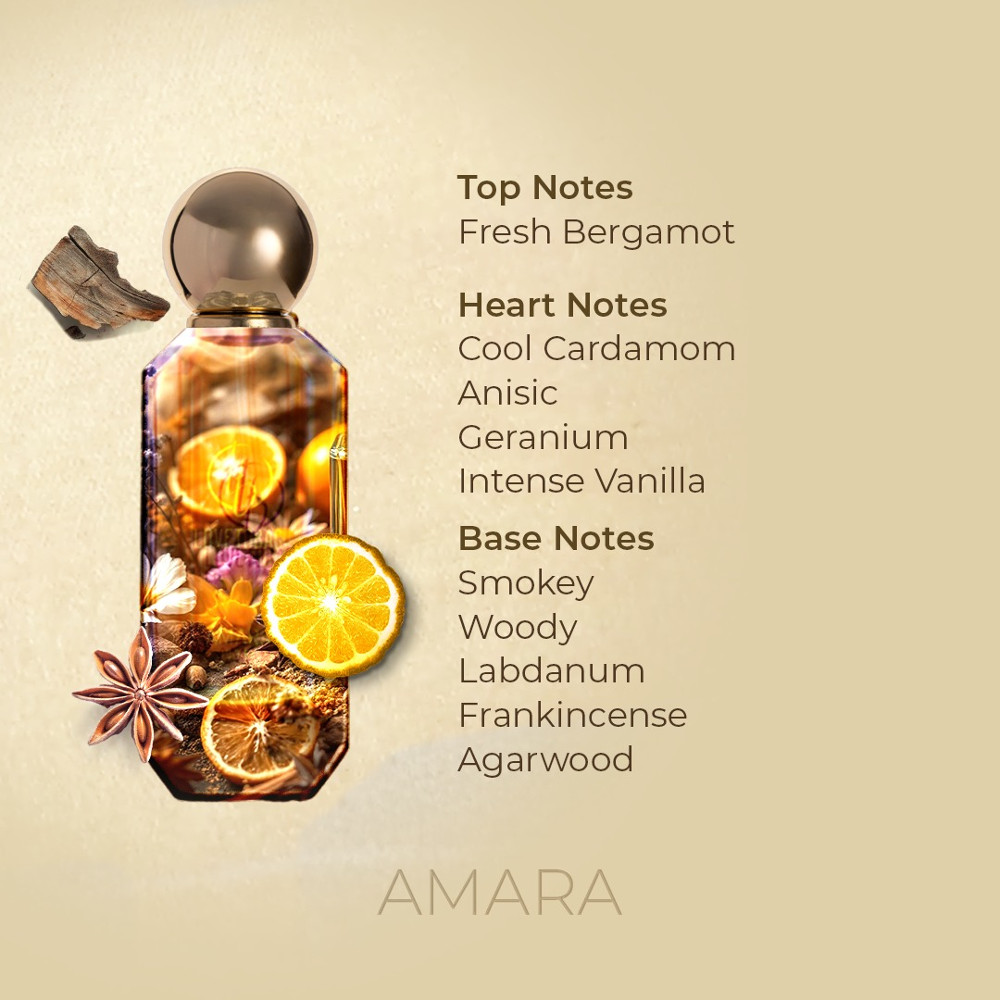 Amara is the scent for a modern Heiress, an embodiment of strength and elegance. This fragrance opens with a vibrant burst of bergamot, while the heart reveals a warm and unexpected blend of cardamom, geranium, anise, and vanilla. The base is rich with dark smoky woods, agarwood, and frankincense, leaving a bold impression.