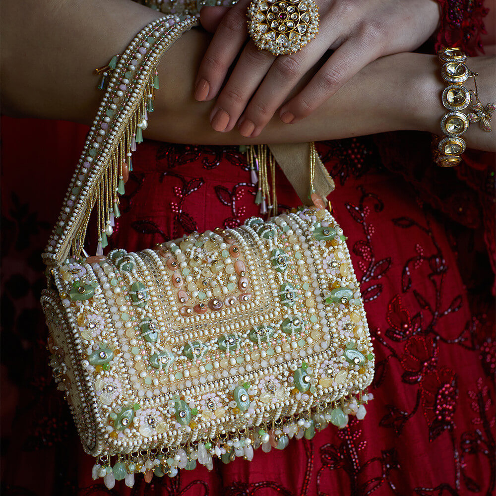 Inspired by opulent encrusted legacy Jadau and Polki jewellery, the Amara Pastel Flapover Clutch Multi Hued is embellished with semi-precious quartz, stones, kundans and lustrous gold silver Japanese beads. It is finished with delicate asymmetrical handmade tassels at the bottom. The addition of our signature embellished handle makes it a statement piece. This collectible statement accessory fits in your valuables like a smartphone, makeup, keys, currency and cards.