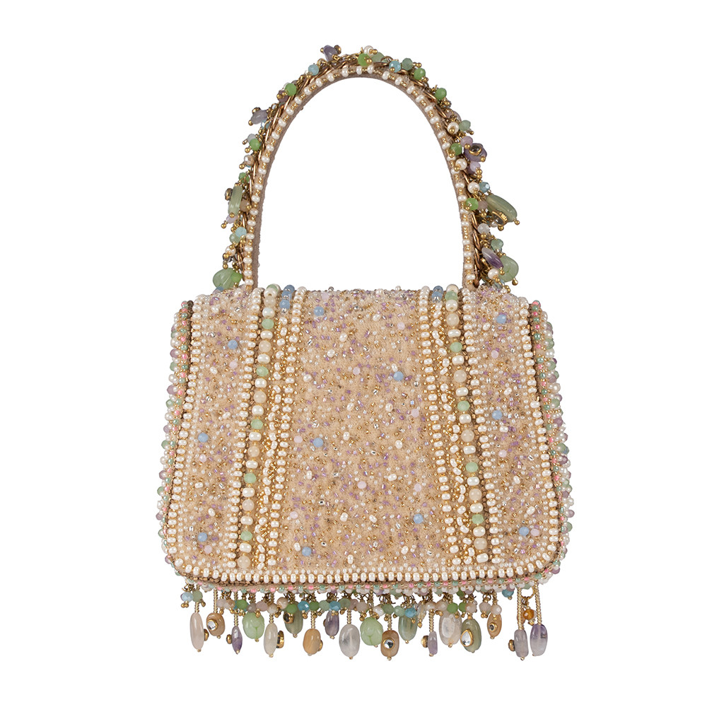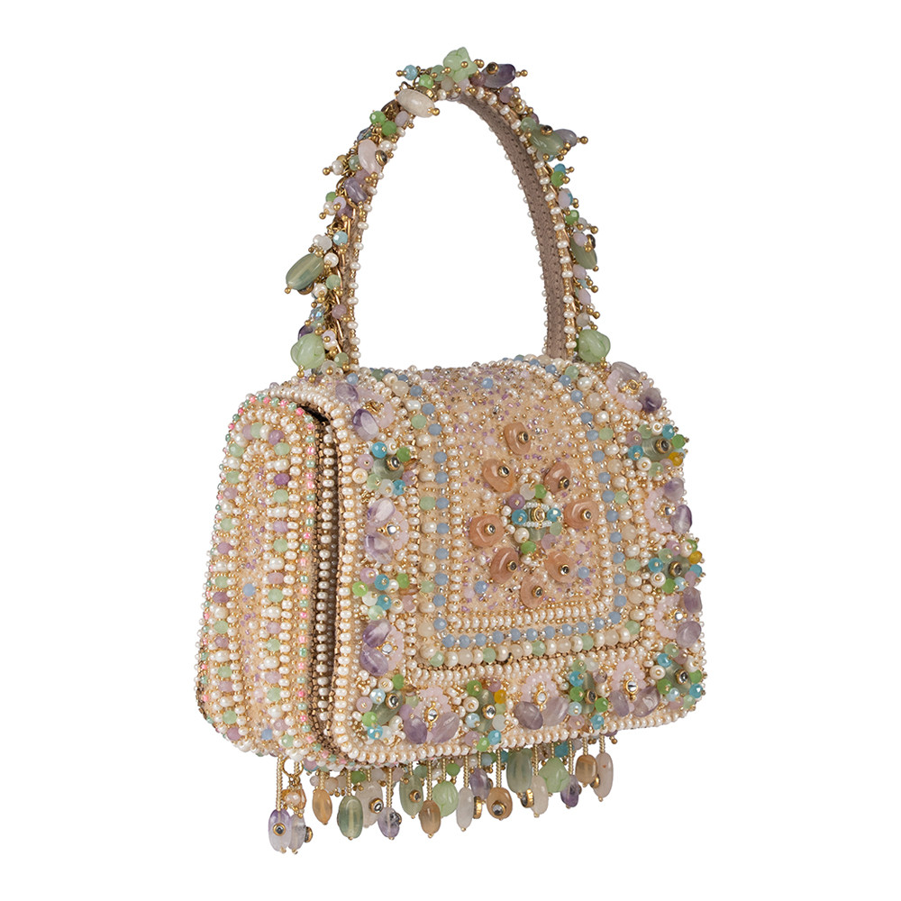 Inspired by opulent encrusted legacy Jadau and Polki jewelry, the Amara Mini Trapezium Amethyst Lavender Multi is embellished with semi-precious amethyst, quartz, stones, kundans and lustrous gold silver precision cut Japanese beads. It is finished with delicate asymmetrical handmade tassels at the bottom. It’s compact, structured shape adds a bold, modern edge, while the embellished top handle and a crossbody chain provide versatile styling options. Perfect for holding makeup, currency, cards and keys, and includes an inside slip pocket for easy organization. Perfect for elevating both day and evening looks.