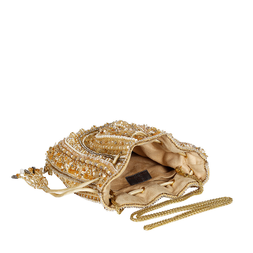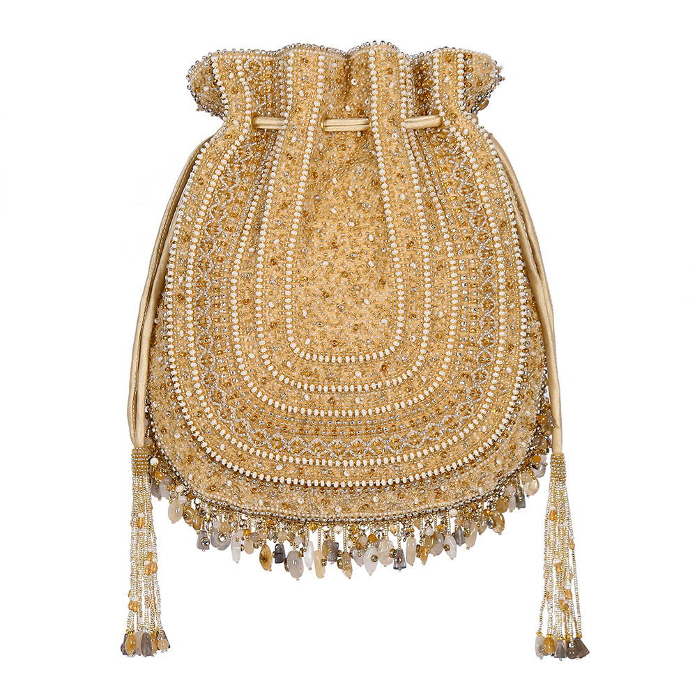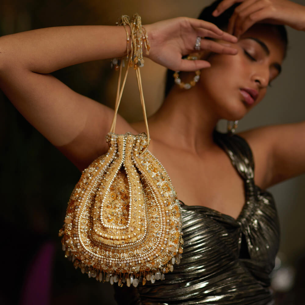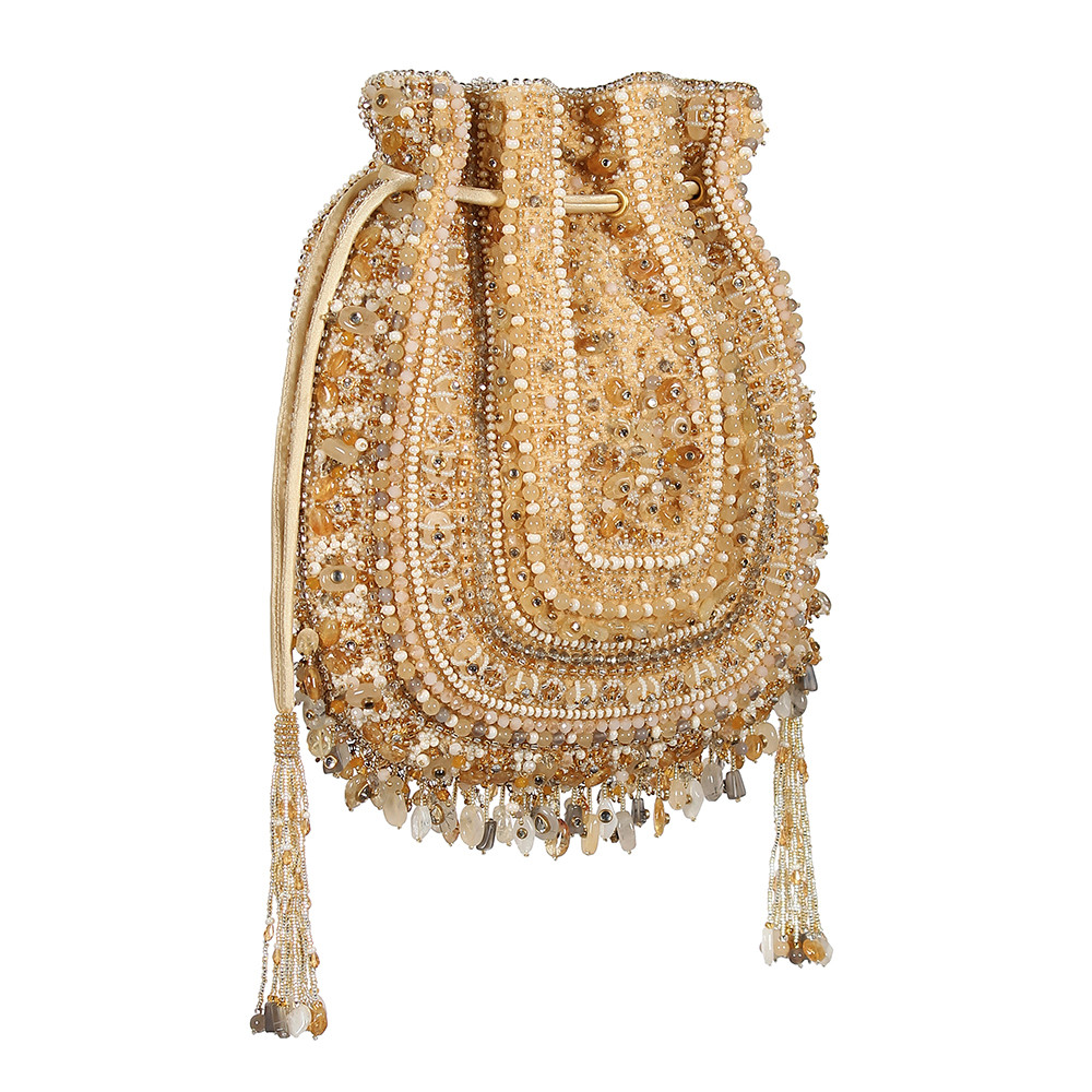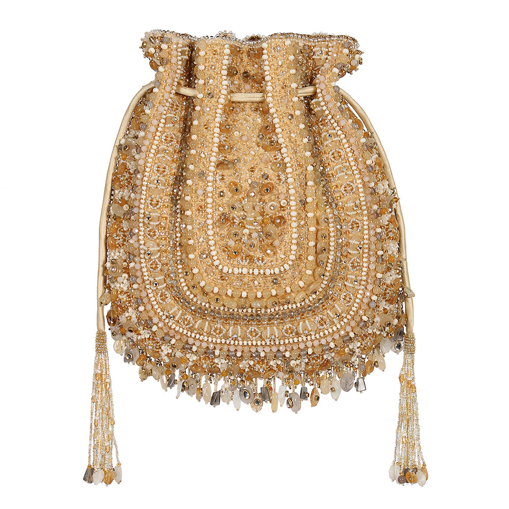 Inspired by opulent encrusted legacy Jadau and Polki jewellery, the Amara Potli Pouch Gold Silver is embellished with semi-precious nuggets, stones, kundans and lustrous gold silver Japanese beads. It is finished with delicate asymmetrical handmade tassels at the bottom. This collectible statement accessory fits in your valuables like a smartphone, makeup, keys, currency and cards.