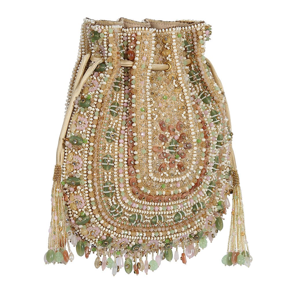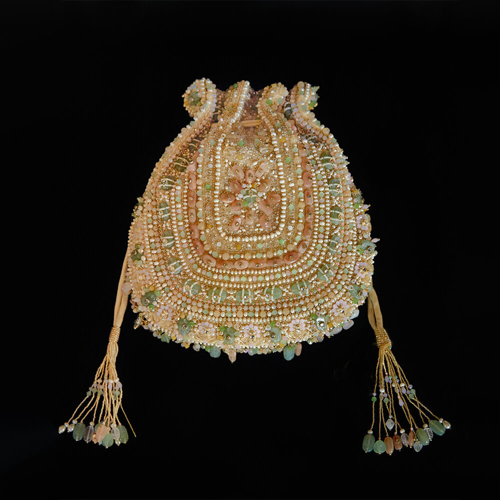 Inspired by opulent encrusted legacy Jadau and Polki jewellery, the Amara Potli Pouch Pastel Multi Hued is embellished with semi-precious quartz, stones, kundans and lustrous gold silver Japanese beads. It is finished with delicate asymmetrical handmade tassels at the bottom. This collectible statement accessory fits in your valuables like a smartphone, makeup, keys, currency and cards.