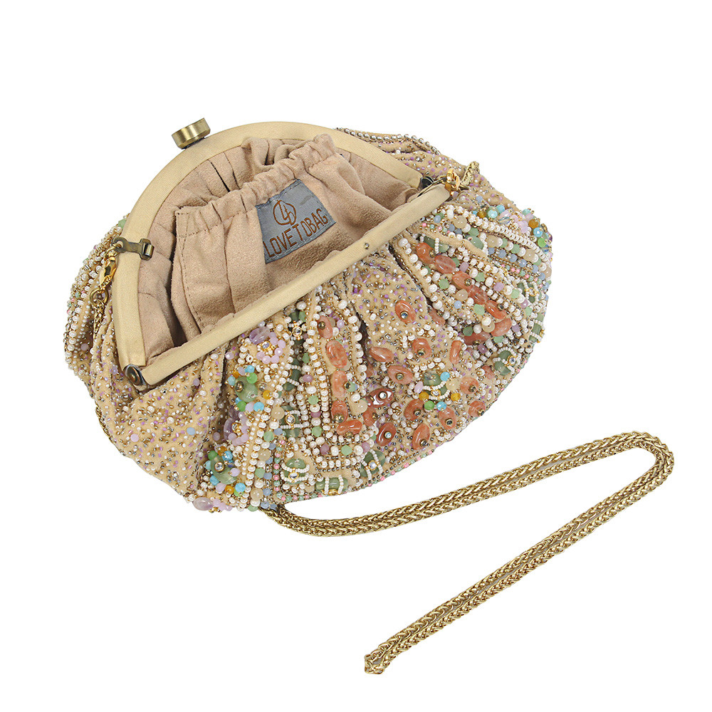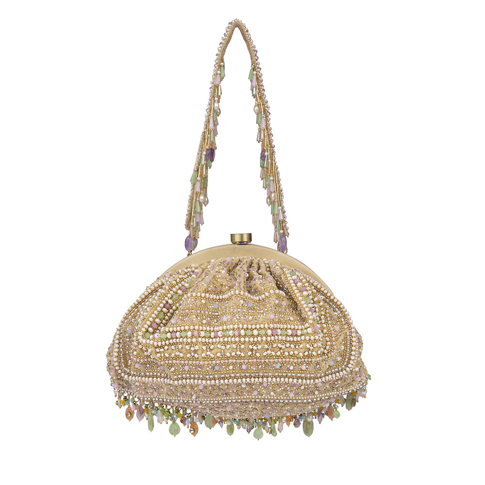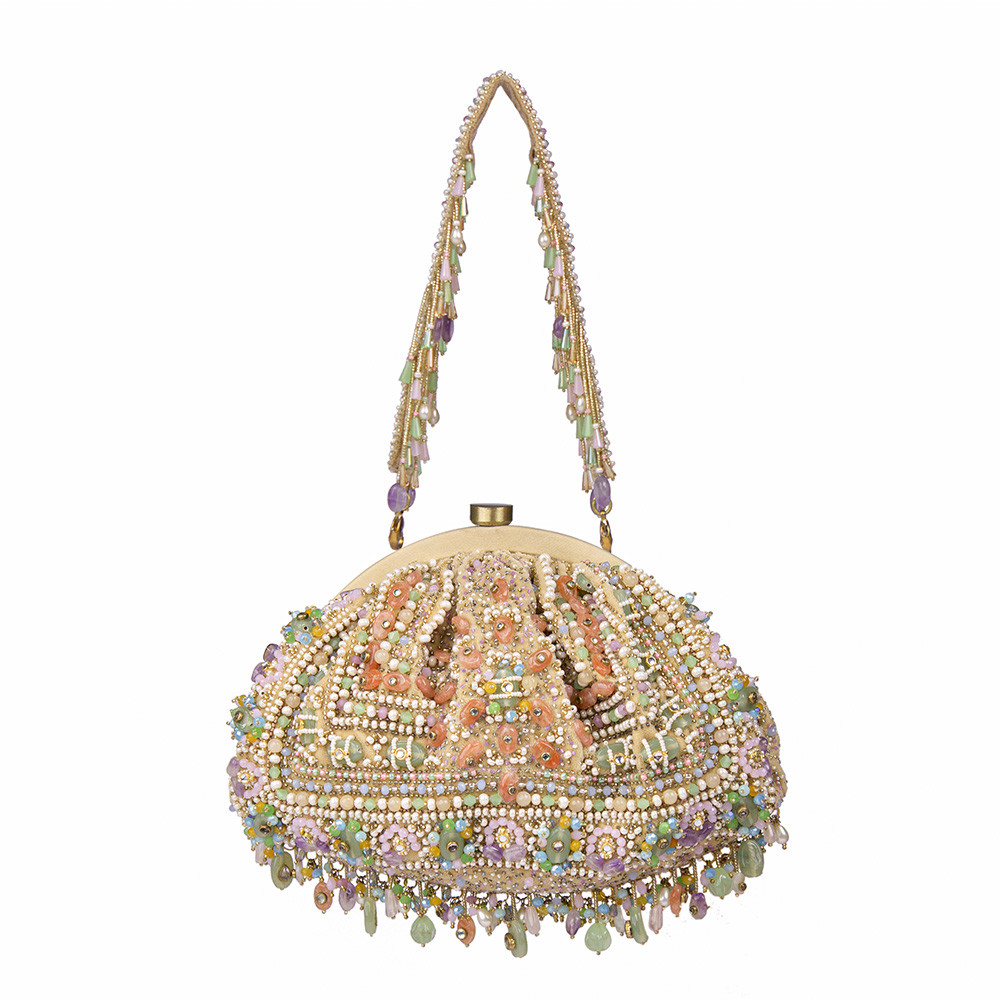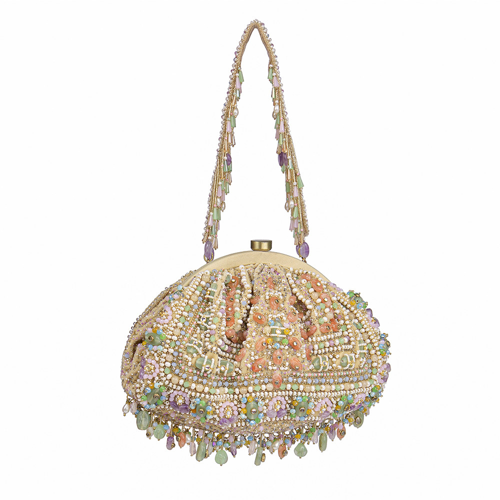 Inspired by opulent encrusted legacy Jadau and Polki jewellery, the Amara Soft Pouch Amethyst Lavender Multi is embellished with semi-precious Amethyst, quartz stones, kundans and lustrous gold silver Japanese beads. It is finished with delicate asymmetrical handmade tassels at the bottom. The addition of our signature embellished handle makes it a statement piece. This collectible statement accessory fits in your valuables like a smartphone, makeup, keys, currency and cards.