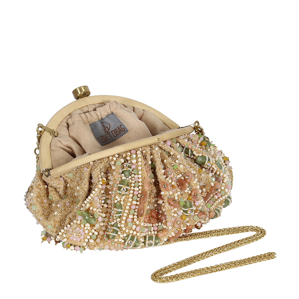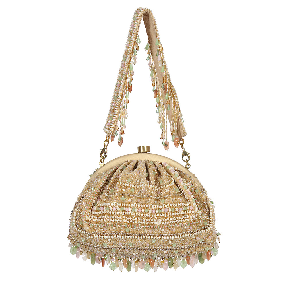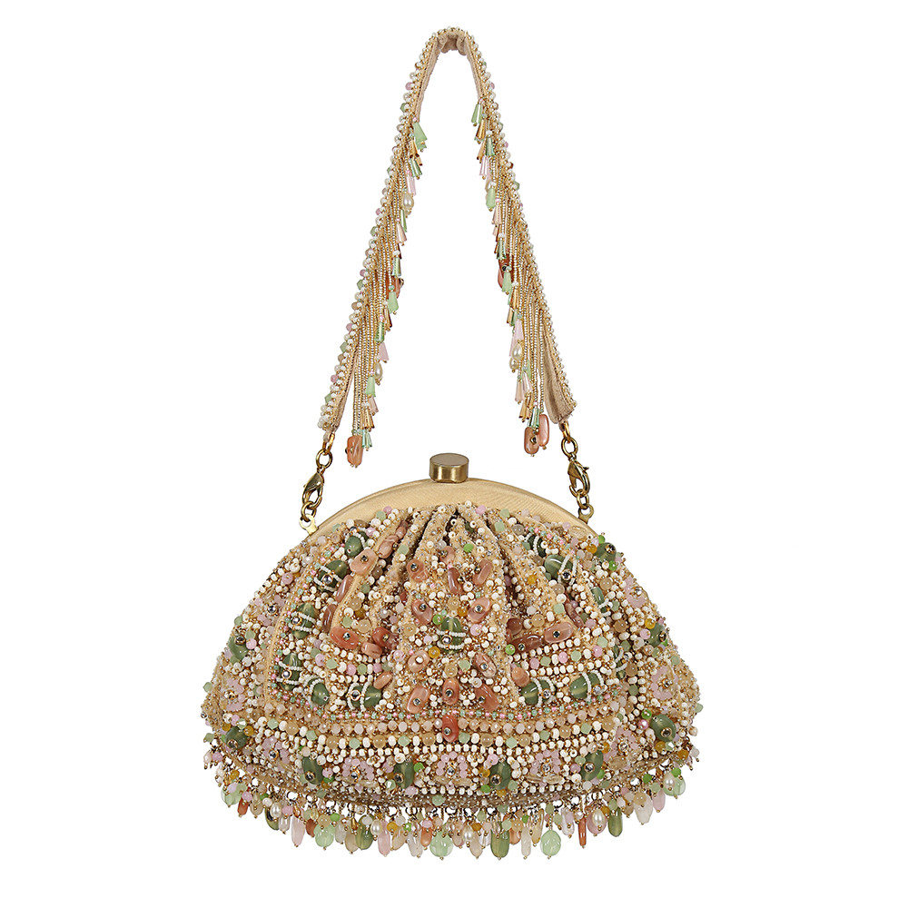 Inspired by opulent encrusted legacy Jadau and Polki jewellery, the Amara Soft Pouch Pastel Multi Hued is embellished with semi-precious quartz, stones, kundans and lustrous gold silver Japanese beads. It is finished with delicate asymmetrical handmade tassels at the bottom. The addition of our signature embellished handle makes it a statement piece. This collectible statement accessory fits in your valuables like a smartphone, makeup, keys, currency and cards.