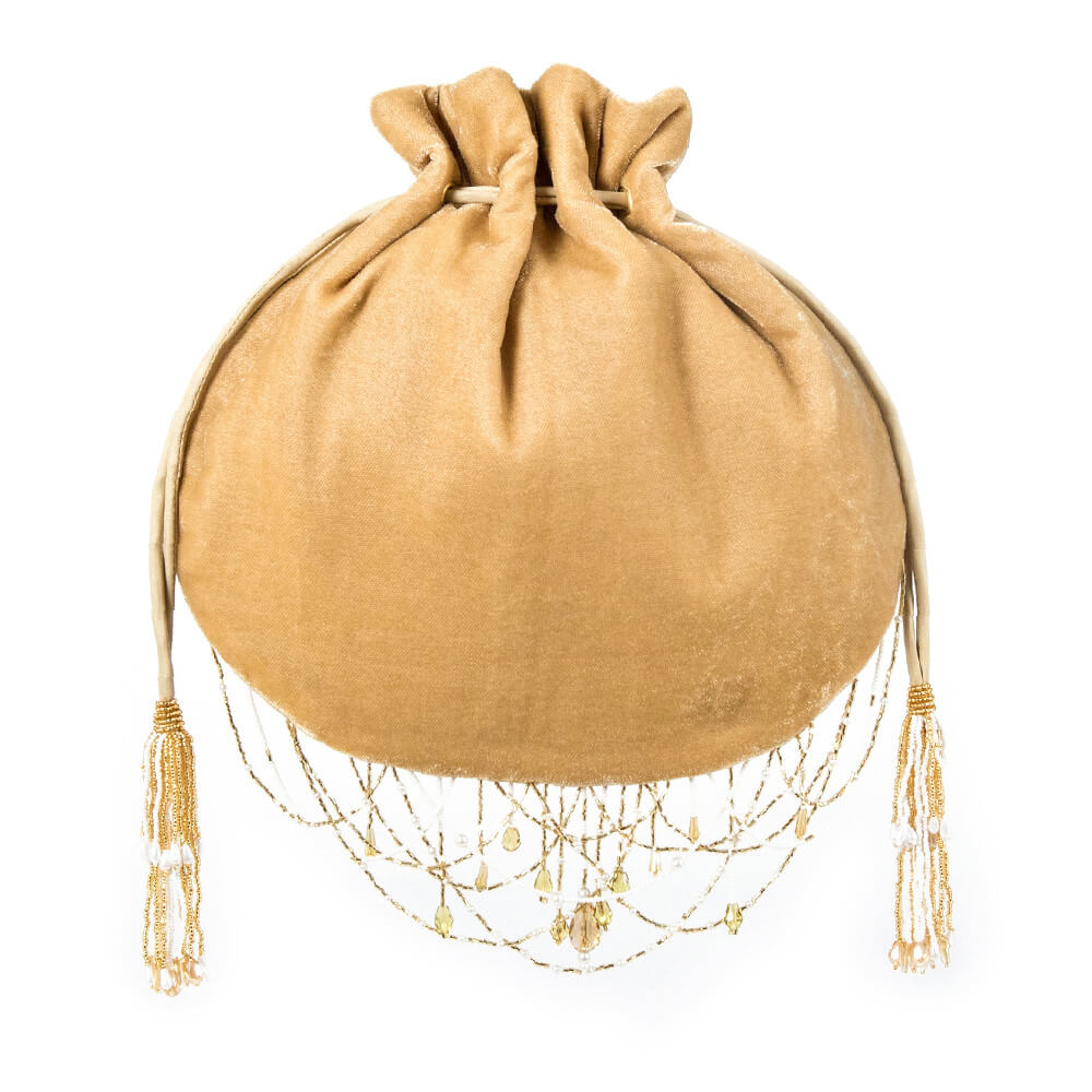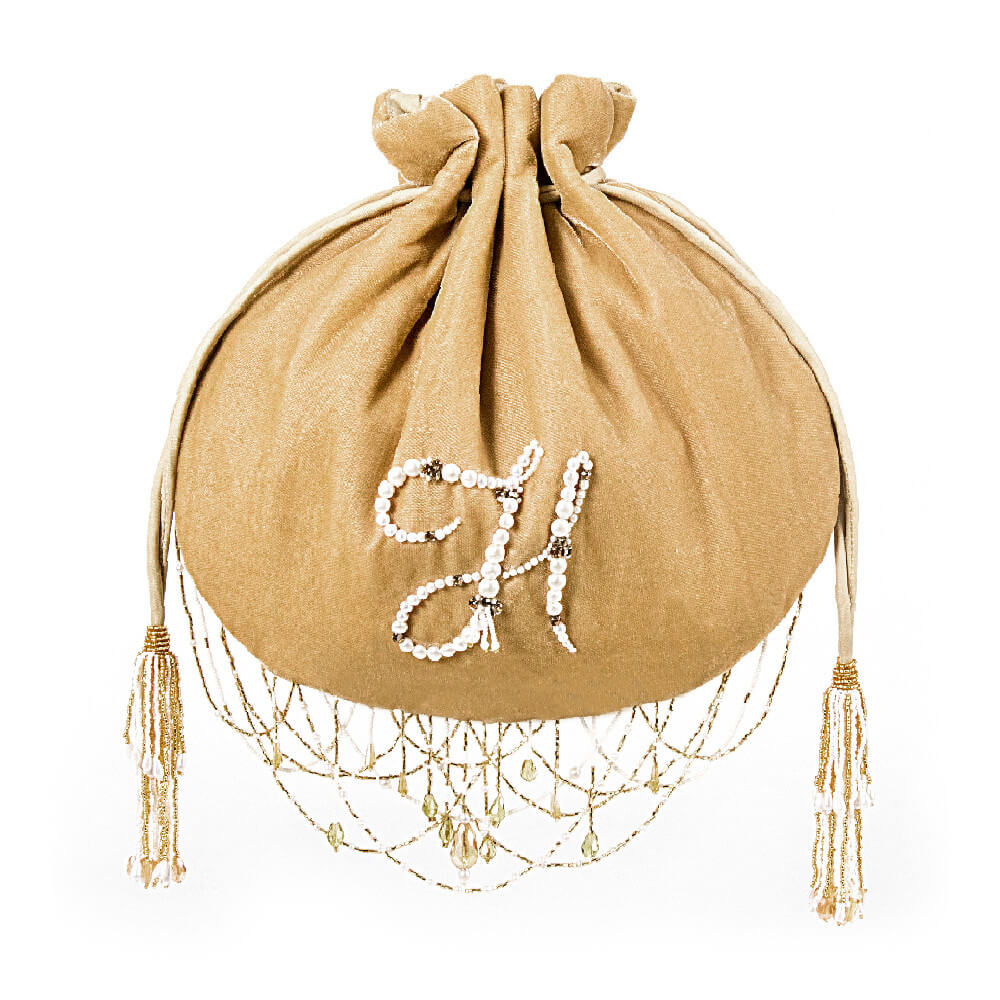 This modern-romantic caligraphy monogram potli is personalized with your initials. Embellished with fine Japanese beads and pearls, diamantes & crystals , it has a satin lining with a slip pocket .The pouch is adorned with handcrafted scallop tassels at the bottom while the wristlet handles have intricate two tiered tassels . We can do monograms in any language, please email your initials to info@lovetobag.com