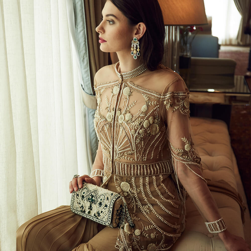 This regal flapover clutch is decadently hand embroidered with lustrous semi precious stones & tinted glass crystals embedded in freshwater and cultured pearls & Japanese micro beads.Inspired by the vintage Jewels at the Sotheby’s museum & those from the Royals of Rajashthan, this is a timeless piece. An encrusted bejeweled motif adorns the front while a nonchalant abstract pearl design dresses the back. It has an exquisite zardosi tassel , a suedette lining & long detachable chain handle. Due to the classic nature of this style, it effortlessly compliments your diamond or polki jewelry , completing your look.