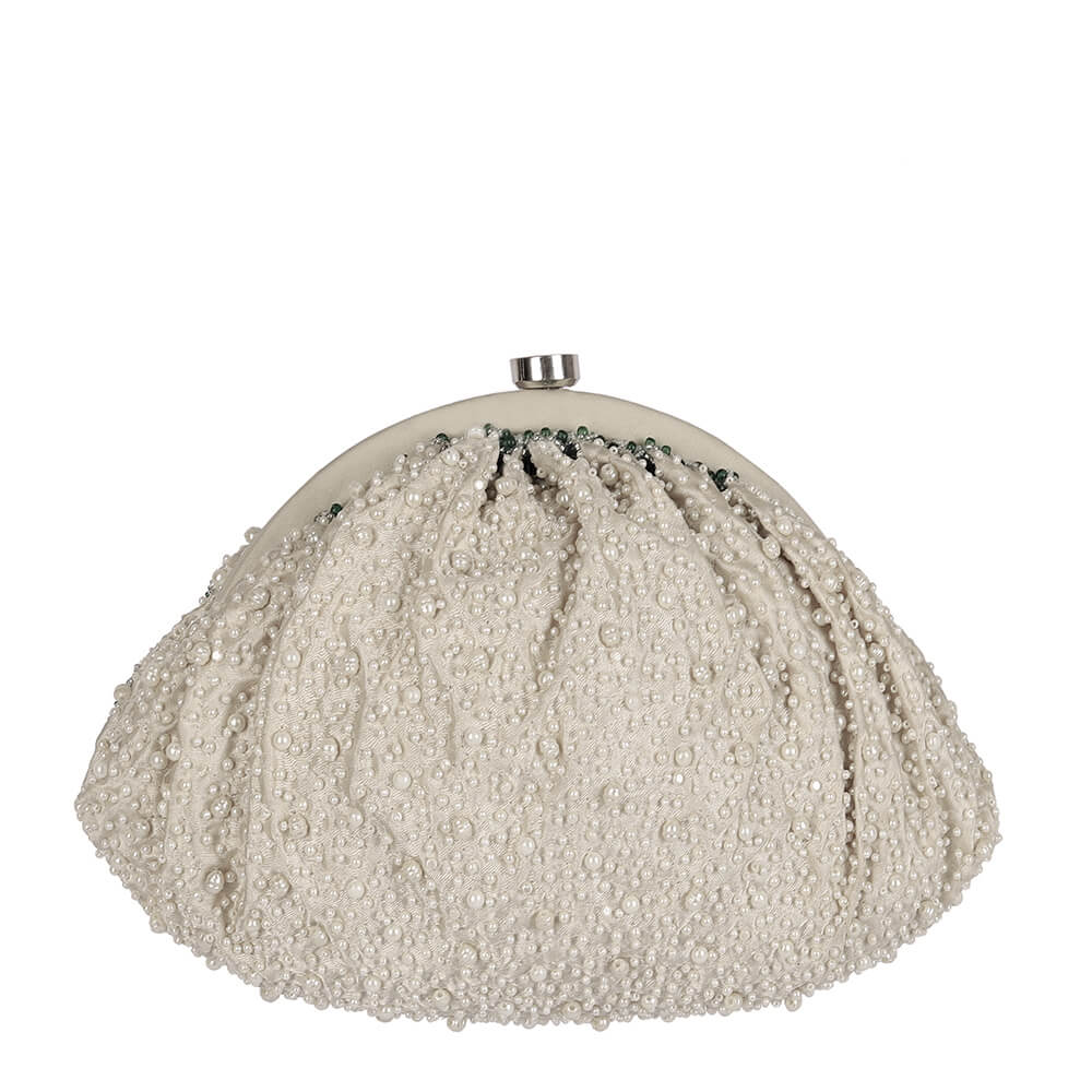 This regal soft pouch is decadently hand embroidered with lustrous semi precious stones , tinted glass crystals & Japanese micro beads embedded in freshwater and cultured pearls.