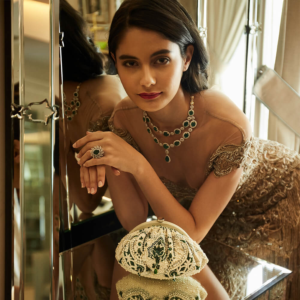 Inspired by the vintage Jewels at the Sotheby’s museum & those from the Royals of Rajashthan , this is a timeless piece . This pouch can be used from both sides – an encrusted bejeweled motif adorns the front while a nonchalant abstract pearl design dresses the back. Due to the classic nature of this style, it effortlessly compliments your diamond or polki jewelry , completing your look.