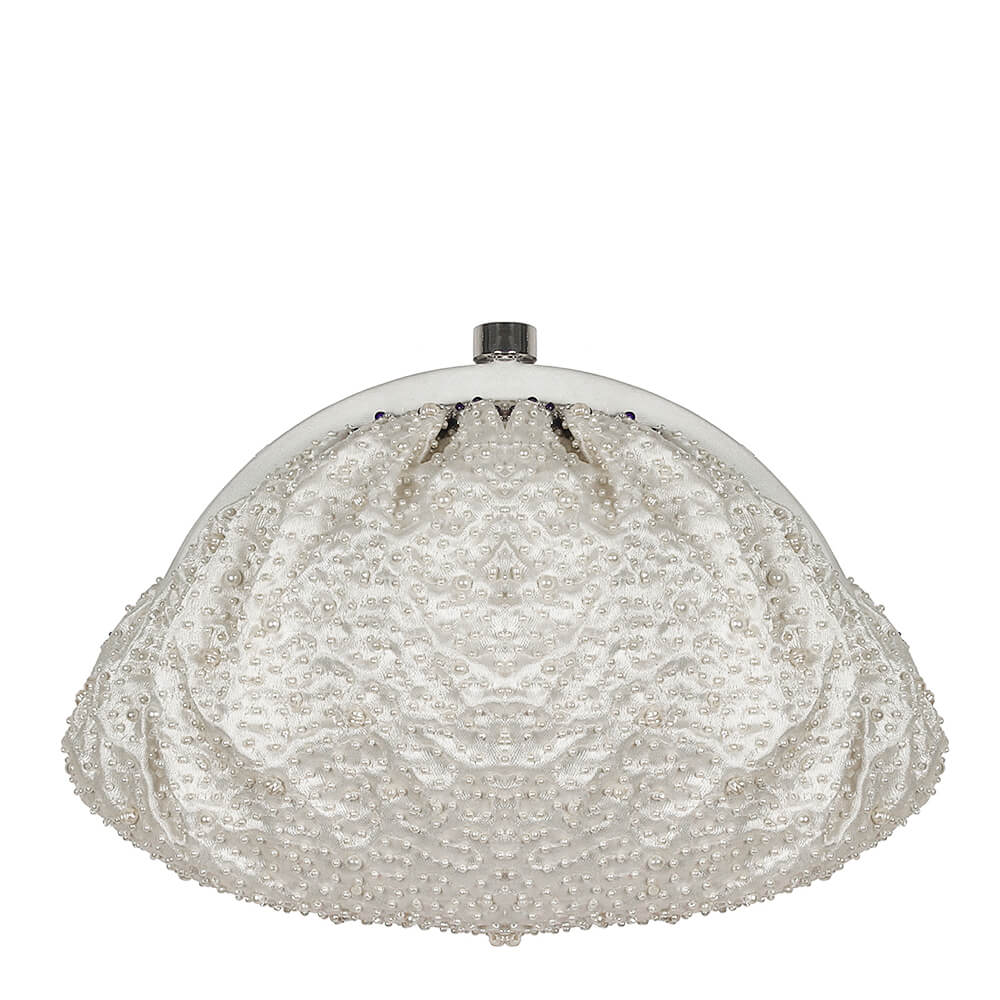 This regal soft pouch is decadently hand embroidered with lustrous semi precious stones , tinted glass crystals & Japanese micro beads embedded in freshwater and cultured pearls.
