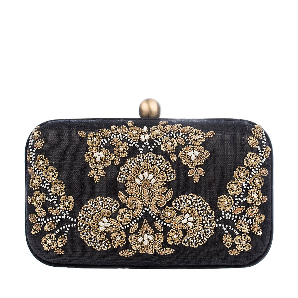 Inspired by the grandeur of the Mughal gardens, this silk box clutch is delicately hand embroidered with fine Japanese bugle beads , sequins and pearls. The design represents a beautiful garland of carnations.