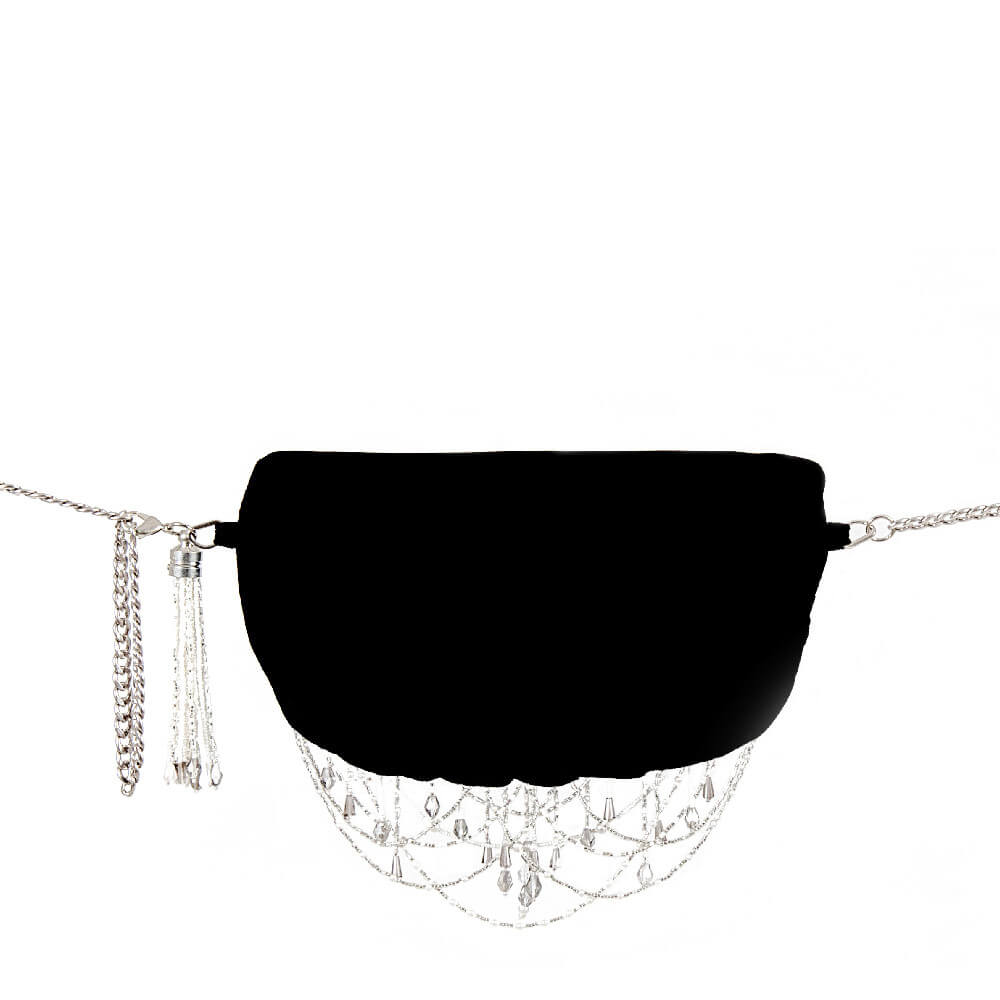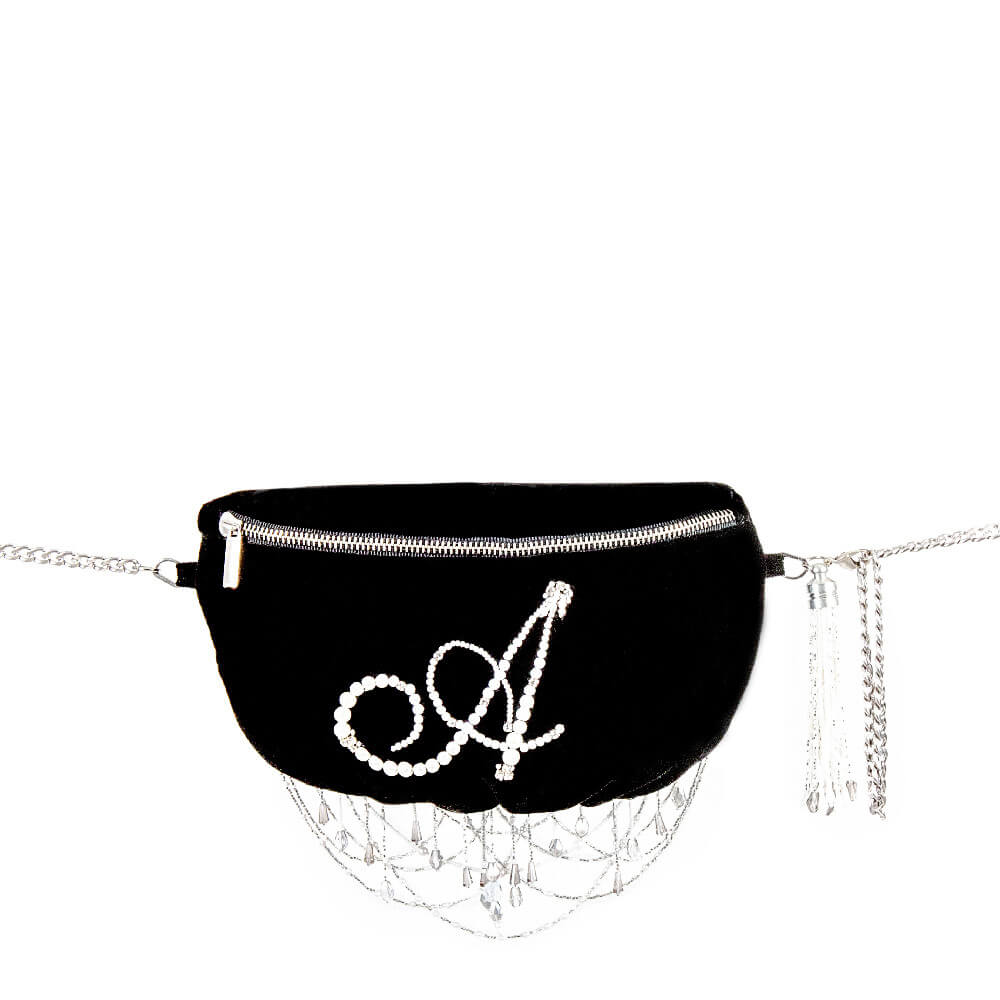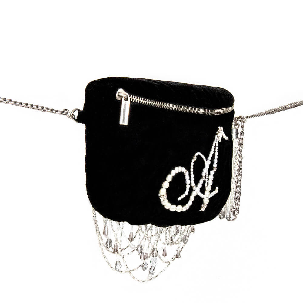 Take your glam essentials to go in this Pearl Monogram Fanny Pack personalized with your initials. Embellished with fine Japanese beads and pearls, diamantes & crystals, and chain belt. The pouch is adorned with handcrafted scallop tassels at the bottom and a pearl tassel on the side. We can do monograms in any language.