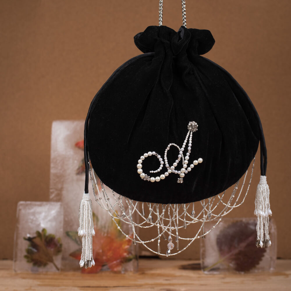 This modern-romantic caligraphy monogram potli is personalized with your initials. Embellished with fine Japanese beads and pearls, diamantes & crystals , it has a satin lining with a slip pocket .The pouch is adorned with handcrafted scallop tassels at the bottom while the wristlet handles have intricate two tiered tassels . We can do monograms in any language, please email your initials to info@lovetobag.com.