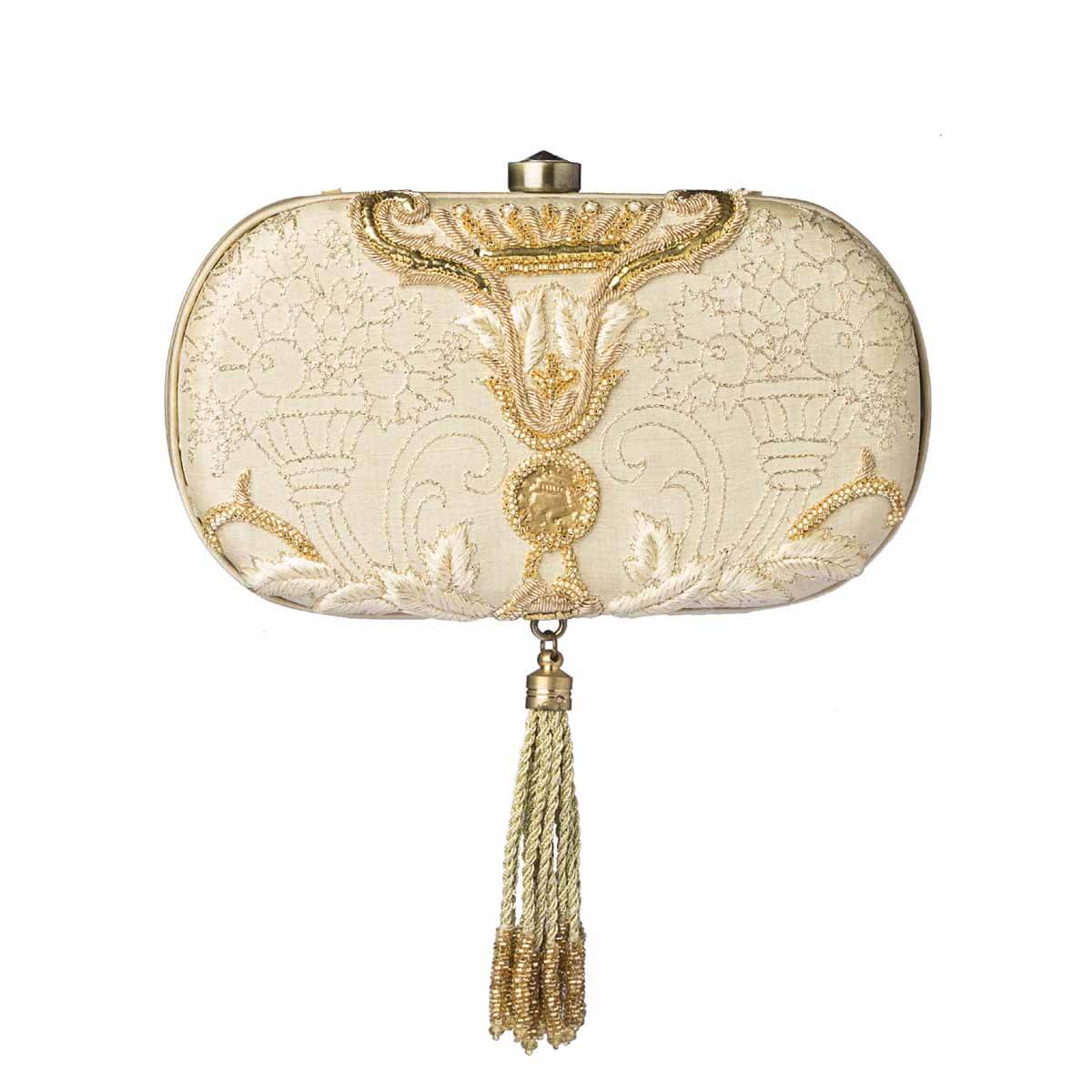 Japanese beads and fine dabka Zardosi hand embroidered pure velvet/silk box clutch with a metal concho , dimante clasp, chain handle and tassel at the bottom.