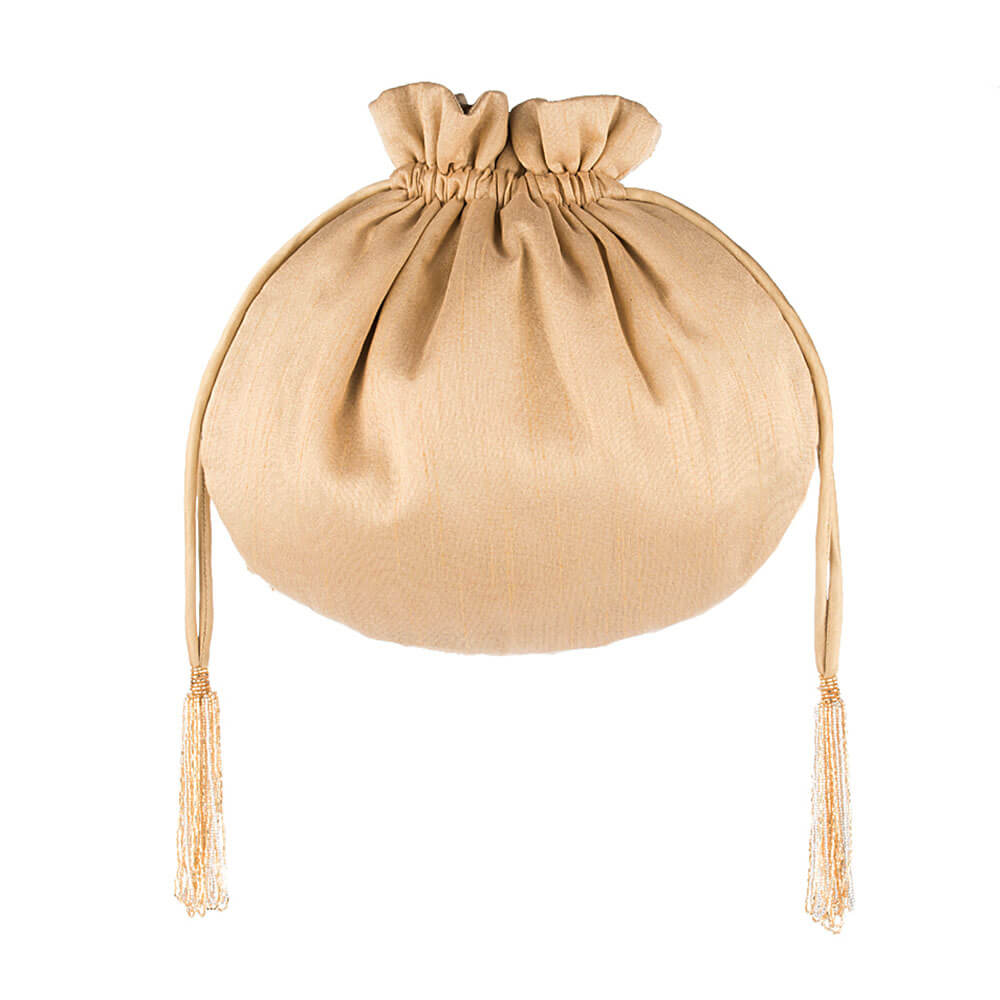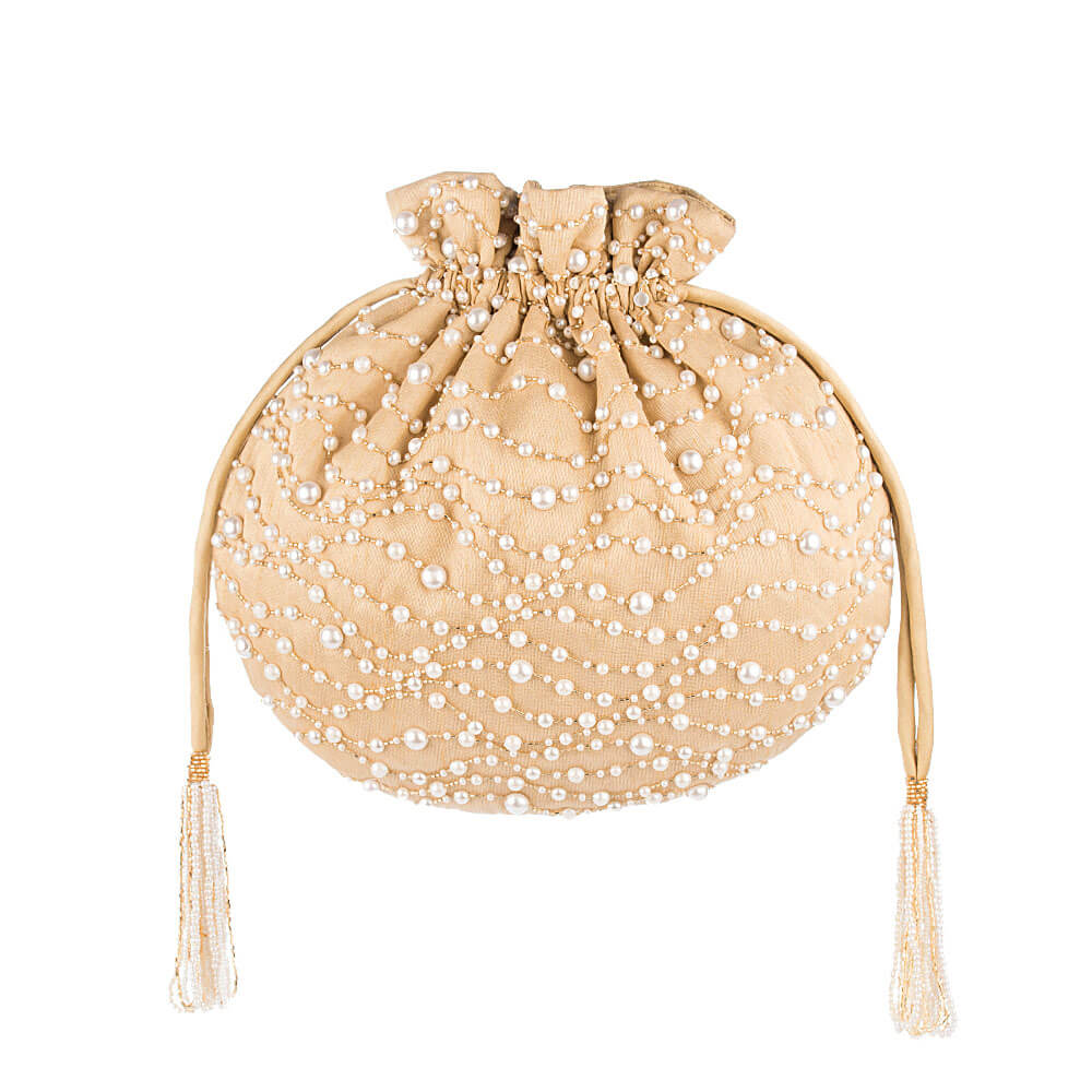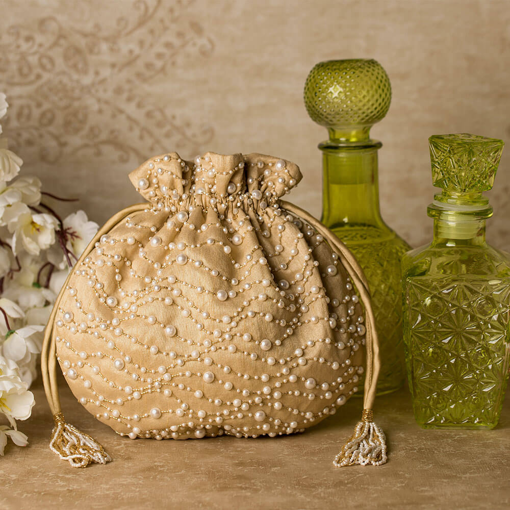 Inspired by the old world charm of of Mughal jewels, this silk pouch is intricately hand embroidered with fine cultured pearls and Japanese bugle beads.
