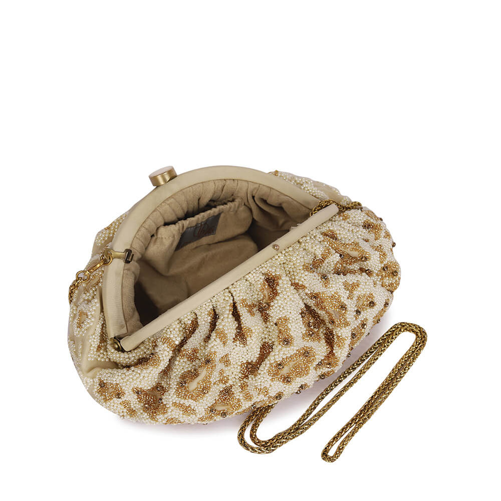 This risqué soft pouch is decadently encrusted with lustrous diamanté, pearls & Japanese metallic/ iridescent micro beads on the signature feline rosettes pattern to capture the sensual yet untamed nature of the female leopard. This pouch can be used from both sides – diamanté encrusted motifs adorn the front while a subtle leopard pearl design dresses the back.