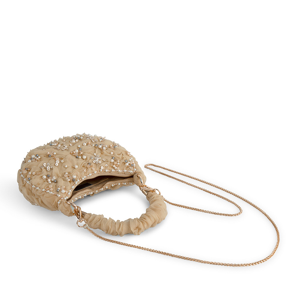 The Coco Crescent bag captures the soft glow of the late afternoon sky with its warm and elegant champagne hue. Hand crafted with delicate organza, it’s adorned with pearls and precision cut Japanese beads for a refined finish. The inventive, curved silhouette features a secure zip closure and a detachable ruched handle with a crossbody chain, offering versatile styling options. Designed to fit makeup, currency, cards, keys and a smartphone, it includes an inside slip pocket for easy organization. Perfect for elevating both day and evening looks.
