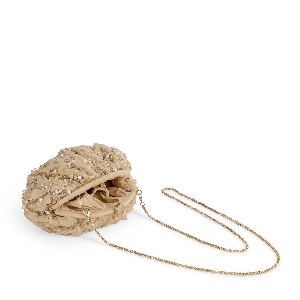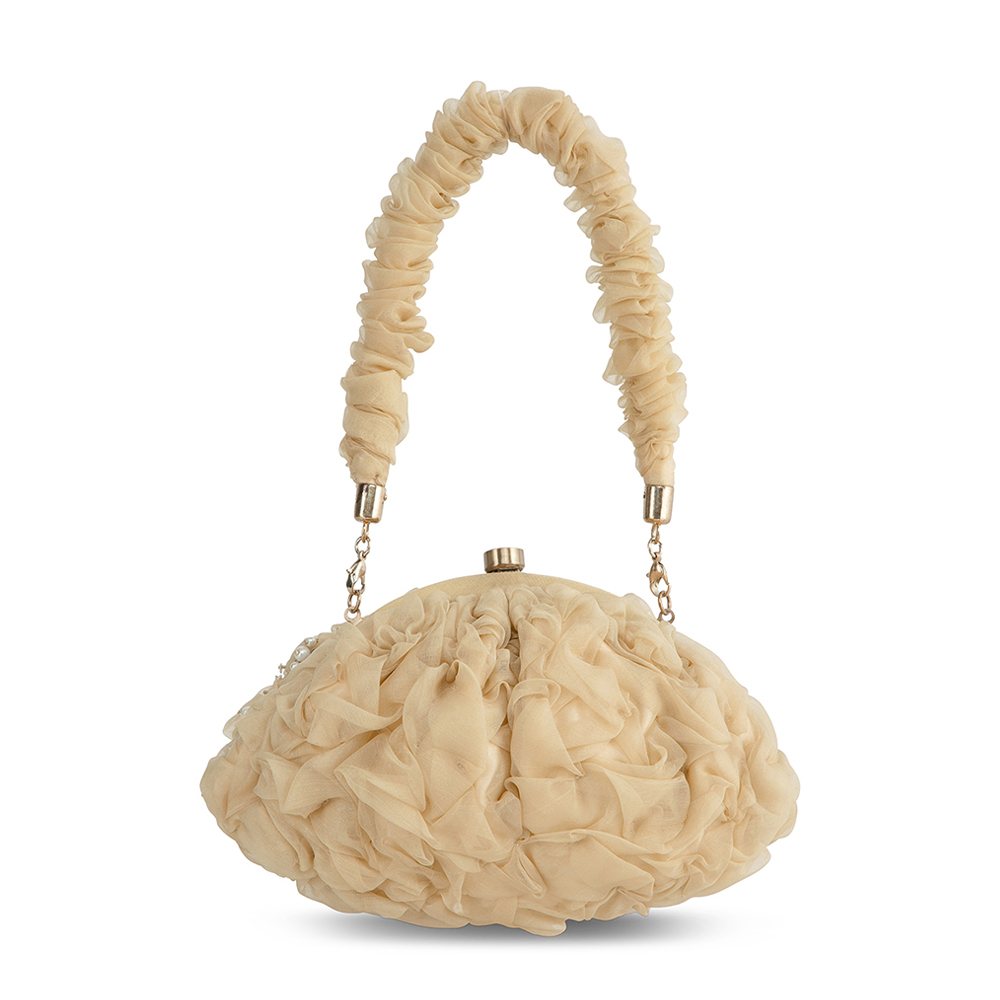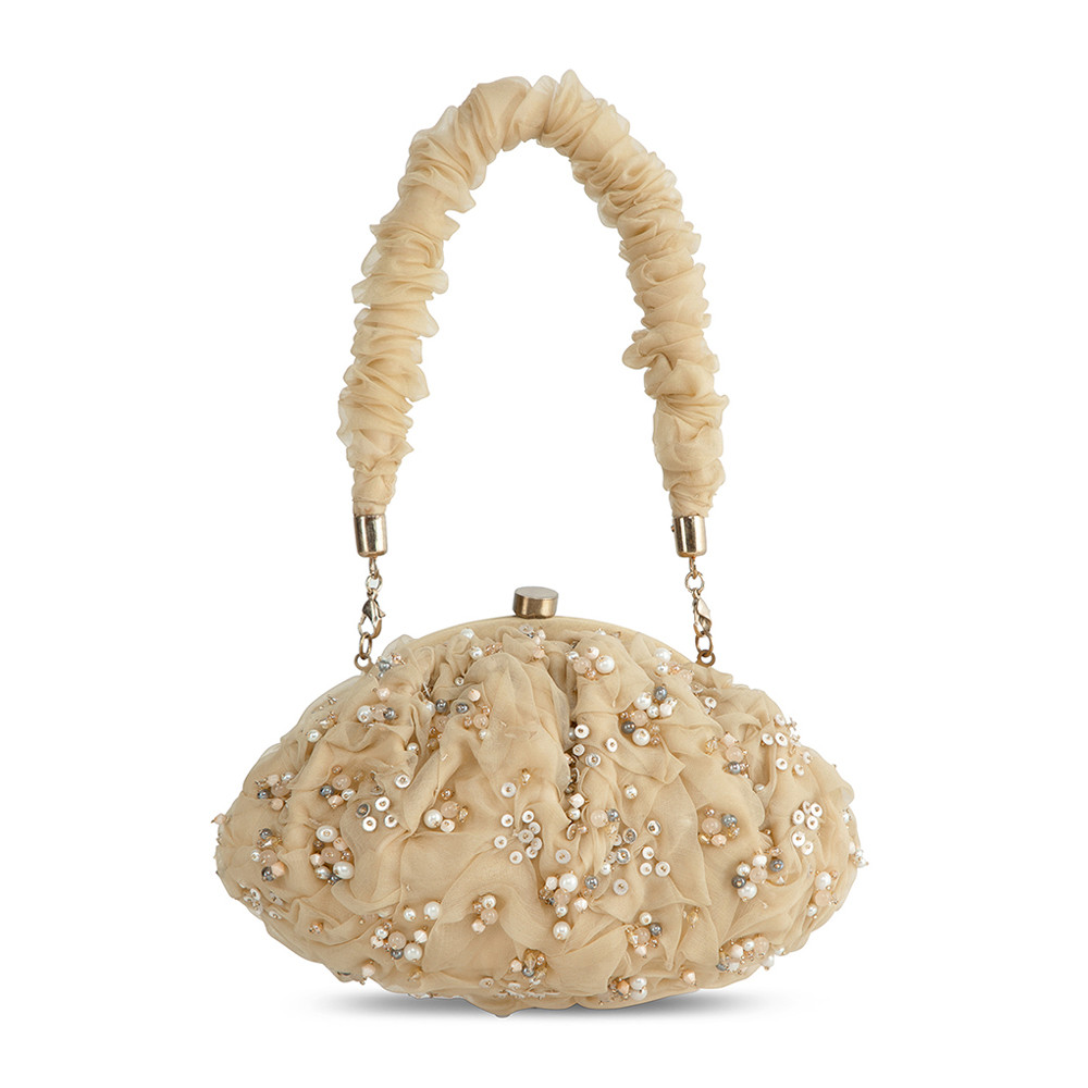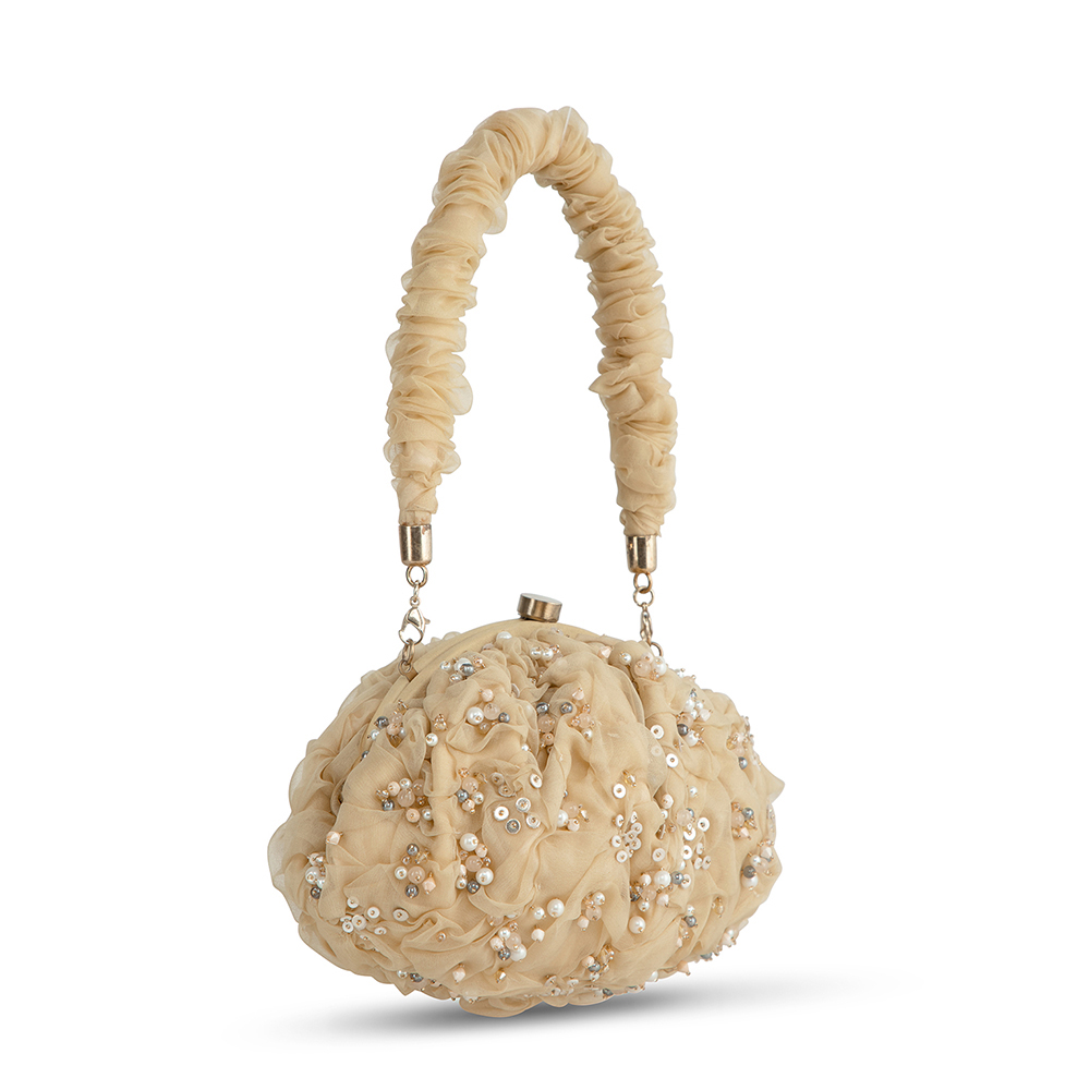 The Coco Soft Pouch bag captures the soft glow of the late afternoon sky with its warm and elegant champagne hue. Hand crafted with delicate organza, it’s adorned with pearls and precision cut Japanese beads for a refined finish. This modern take on the vintage frame bag and a metallic clasp closure, has a detachable ruched handle & crossbody chain, for versatile styling, Designed to fit makeup, currency, cards, keys and a smartphone, it includes an inside slip pocket for easy organization. Perfect for elevating both day and evening looks.